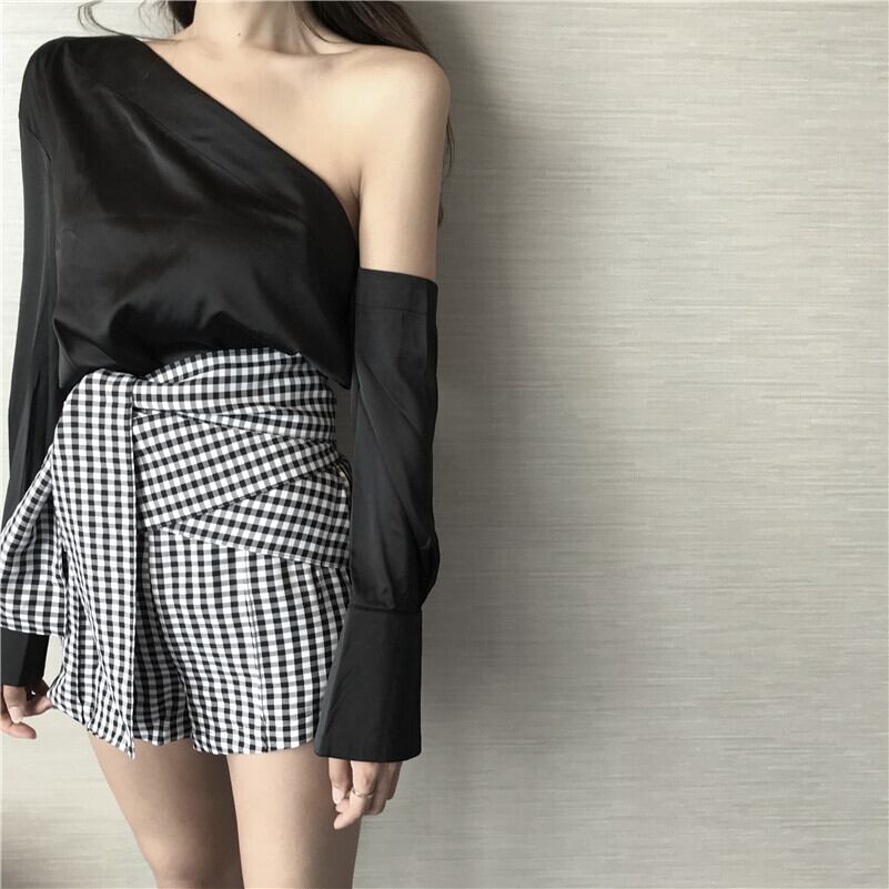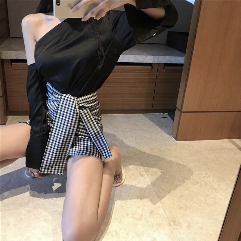 色:ブラックトップシングルピース,チェック柄ショートパンツシングルピース