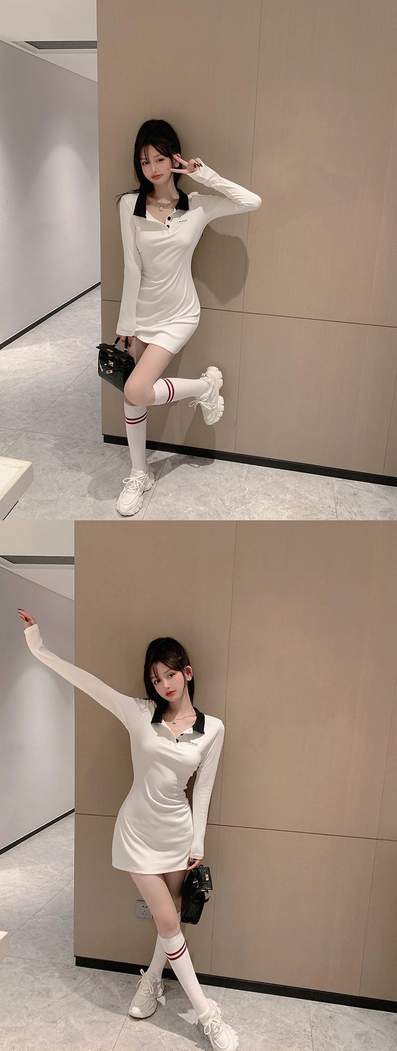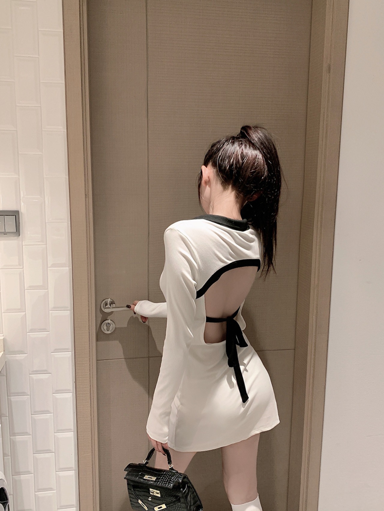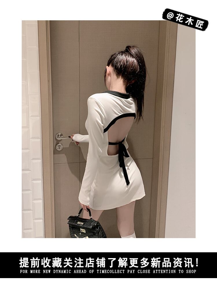 カラー長袖スリーブドレス オータムバックレスウェスト薄手スカート ロング 秋物 10/5 秋冬 オータム ウインター ナチュラル mi4676646739047
