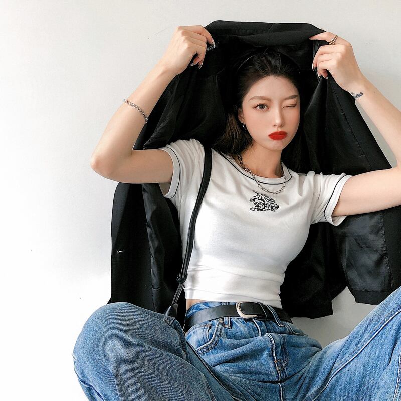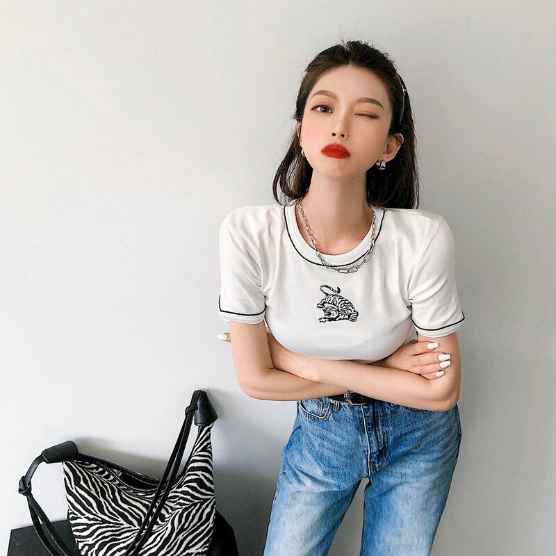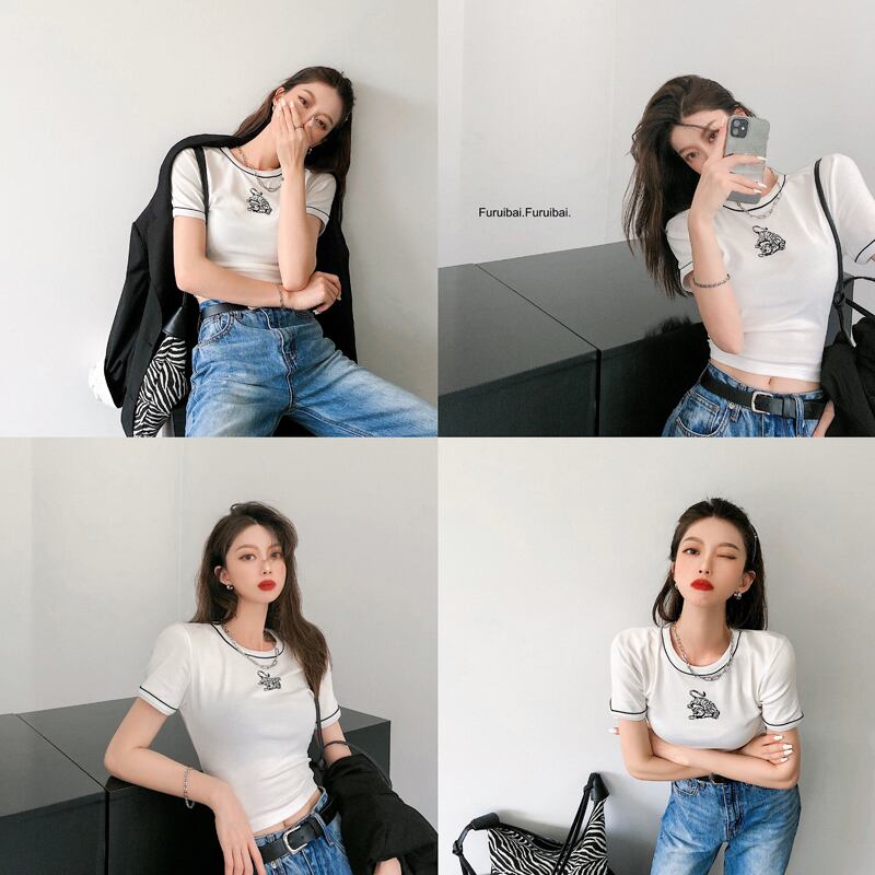 カラープリント柄ショートTシャツ オータムスリムフィット薄手トップス 秋物 10/5 秋冬 オータム ウインター ナチュラル mi4680566450775