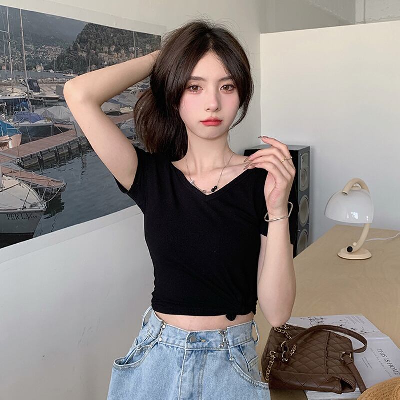 ブラックショートTシャツ シャツ サマースタイルVネックスリムトップス 夏物 10/5 秋冬 オータム ウインター ナチュラル mi465786708505