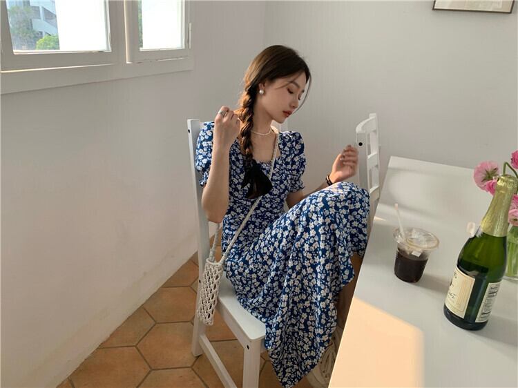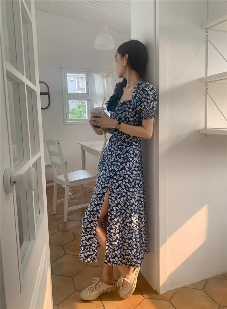 Vネックスリーブフローラルドレス サマースリットウェストAラインスカート 夏物 花柄 10/5 秋冬 オータム ウインター ナチュラル mi4686421120980
