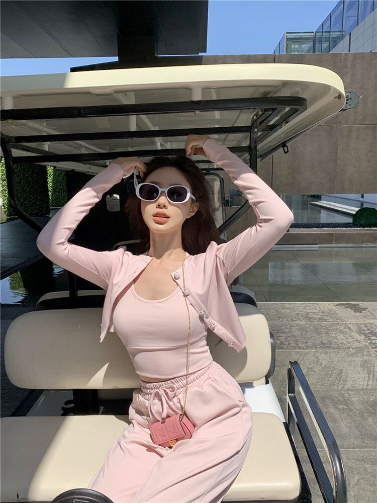 色:ピンクのジャケット一枚,ピンクベストワンピース,ピンクのズボンのワンピース,緑のアウタータワーワンピース,グリーンベストワンピース,緑のズボン