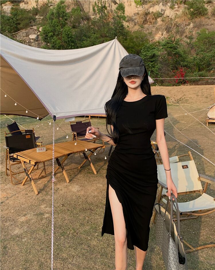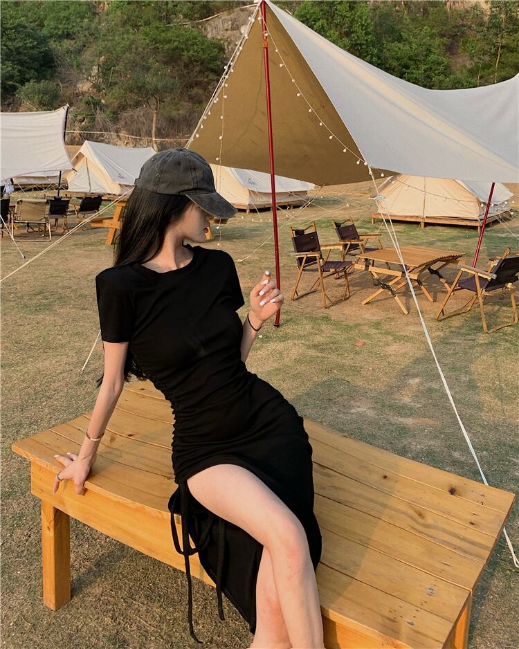グレーTシャツ ドレス サマースリムウェストギャザースリットスカート 夏物 10/5 秋冬 オータム ウインター ナチュラル mi4635686898594