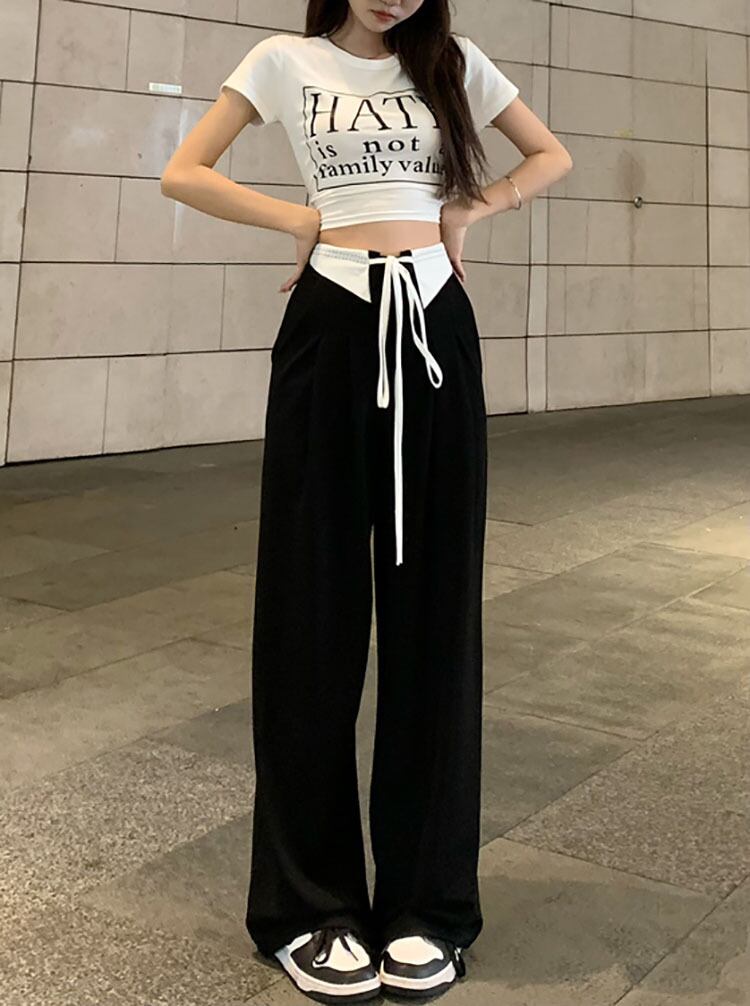 カラーレースブラックパンツ オータムルーズハイウェストウェストスリムカジュアル 秋物 10/5 秋冬 オータム ウインター ナチュラル mi4655794256097