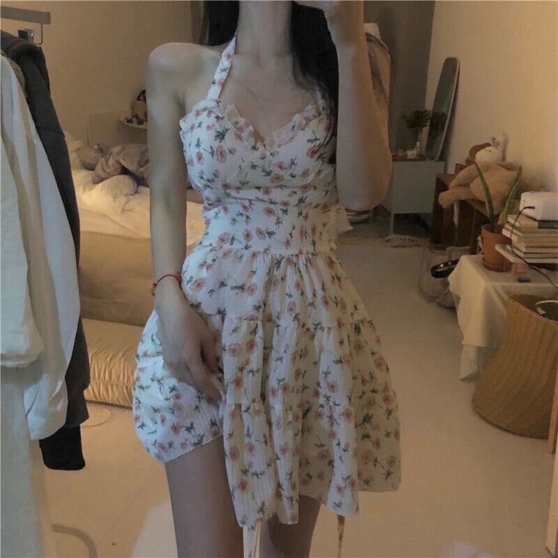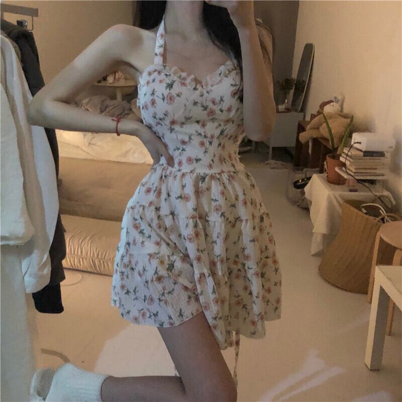 フローラルホルタードレス サマースタイルウェスト薄手Aラインスカート 夏物 花柄 10/5 秋冬 オータム ウインター ナチュラル mi4619467373823