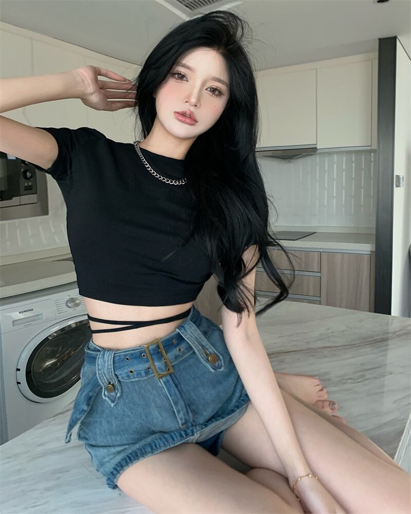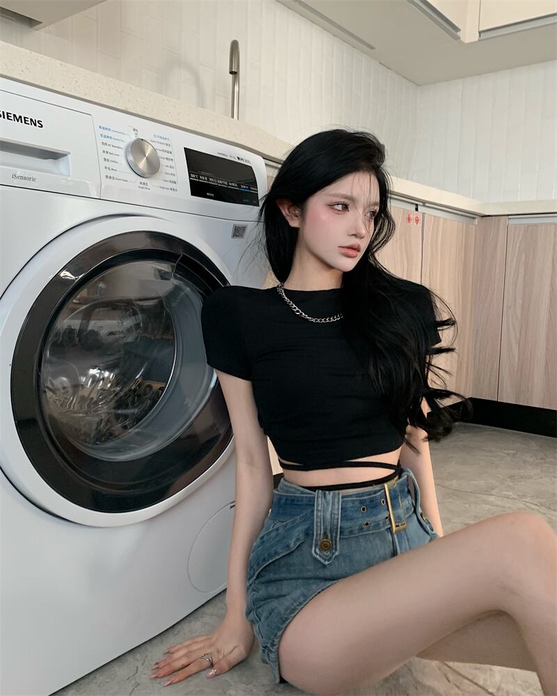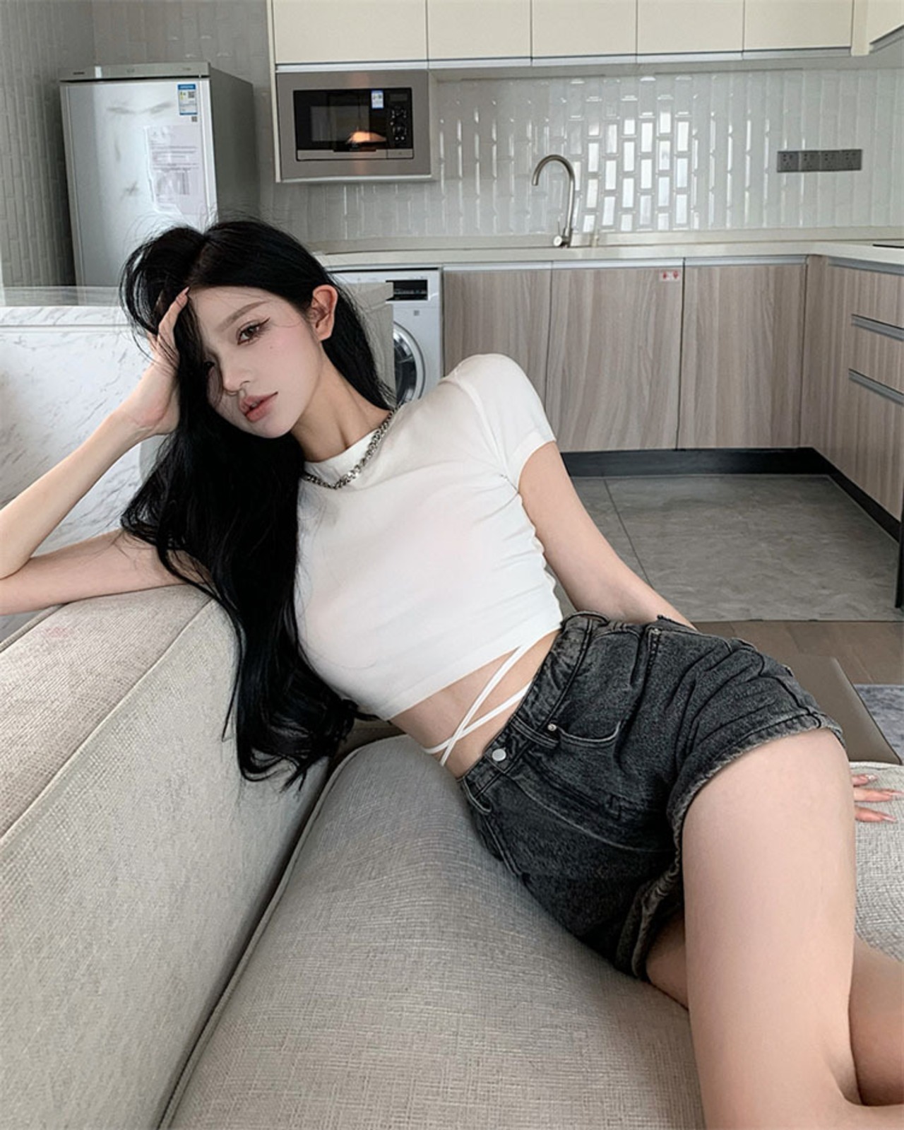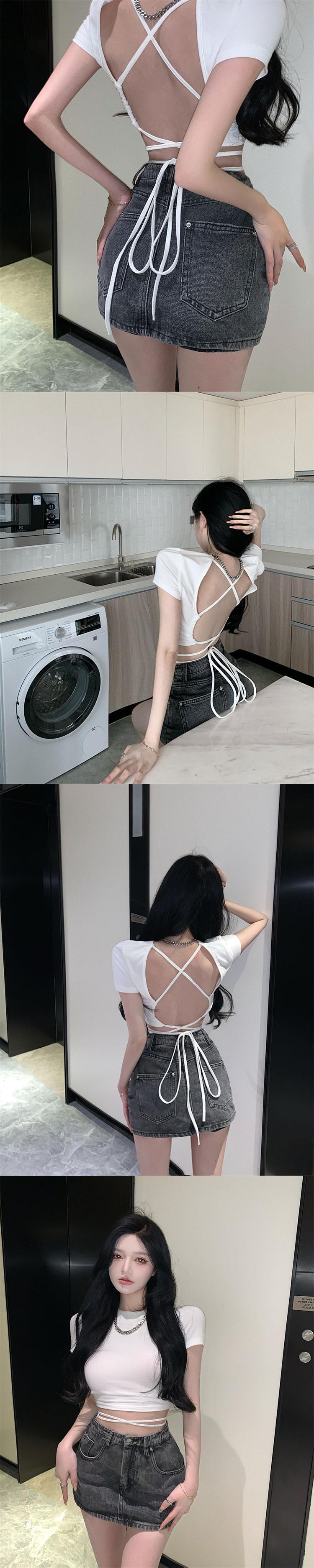 バックレスクロスストラップ ショートTシャツ シャツ サマーブラックスリムトップス 夏物 10/5 秋冬 オータム ウインター ナチュラル mi4688519106778