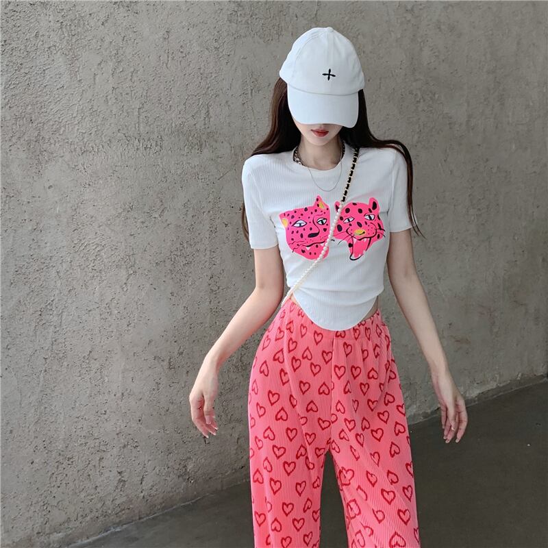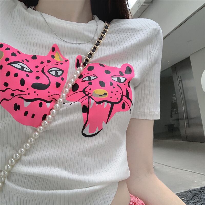 プリント柄ホワイトTシャツ サマースタイルスリムショートトップス 夏物 10/5 秋冬 オータム ウインター ナチュラル mi4680533689827
