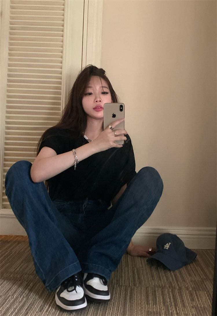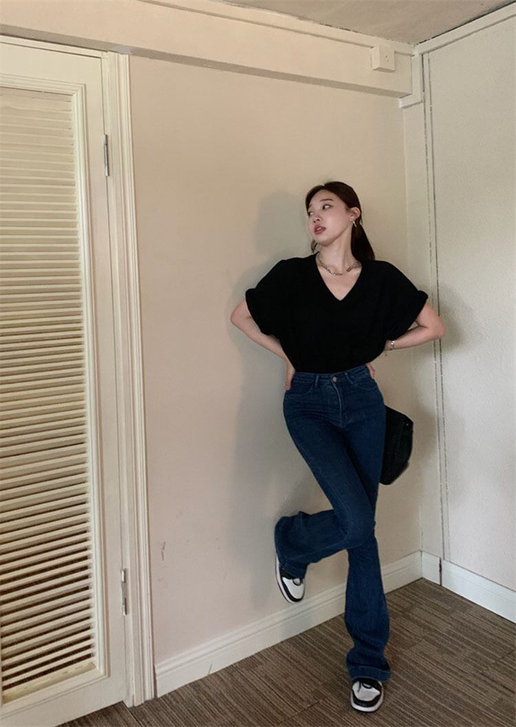 スタンダードVネックブラックTシャツ サマールーズトップス レトロ 夏物 10/5 秋冬 オータム ウインター ナチュラル mi4691297900672