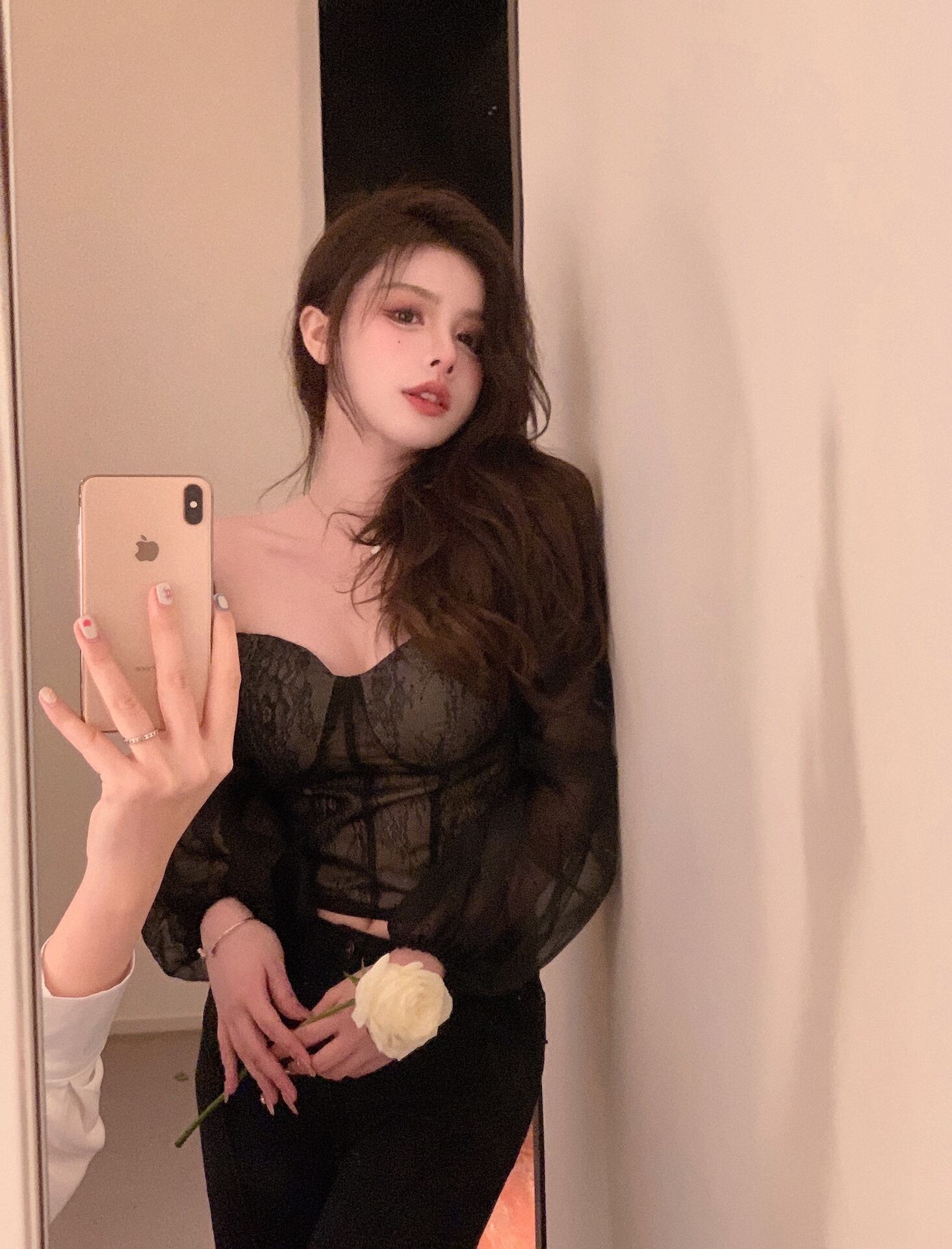ブラックメッシュレースシャツ スリムショートトップス 10/5 秋冬 オータム ウインター ナチュラル mi466022947807