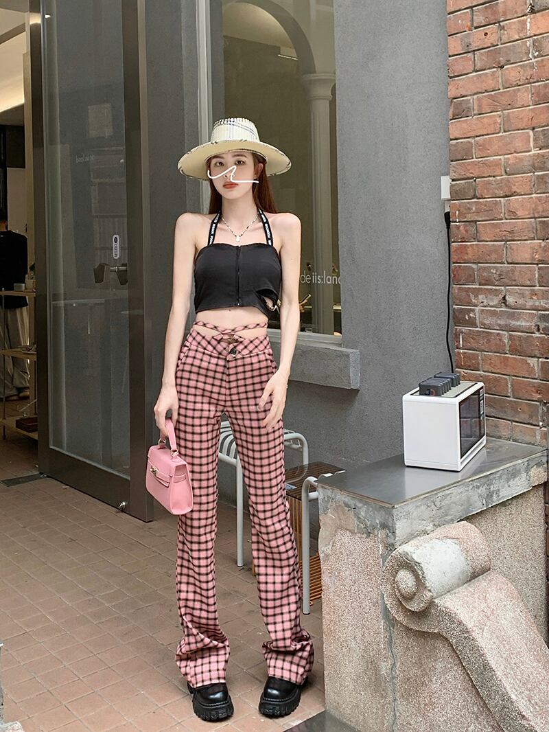格子柄カジュアルパンツ オータムバンドハイウェストウェスト薄手 ピンク レッド ストリート 秋物 10/5 秋冬 オータム ウインター ナチュラル mi4630503097622