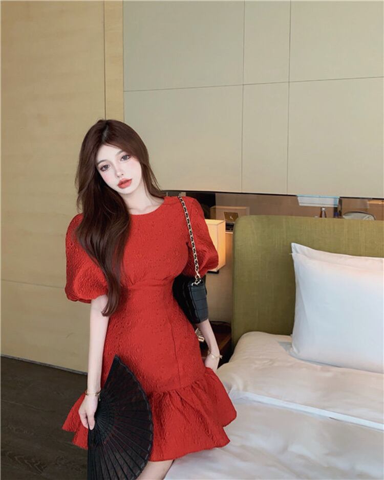 スタンダードレッドスリーブドレス サマープリーツウェスト薄手ショートスカート レトロ 夏物 10/5 秋冬 オータム ウインター ナチュラル mi4636012133103