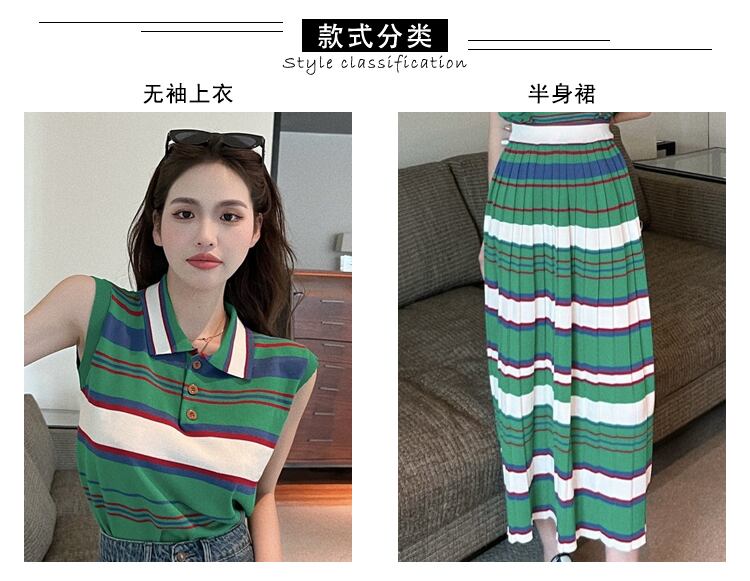カラーストライプニットサマーノースリーブトップス プリーツスカート セット 夏物 10/5 秋冬 オータム ウインター ナチュラル mi4694791561986