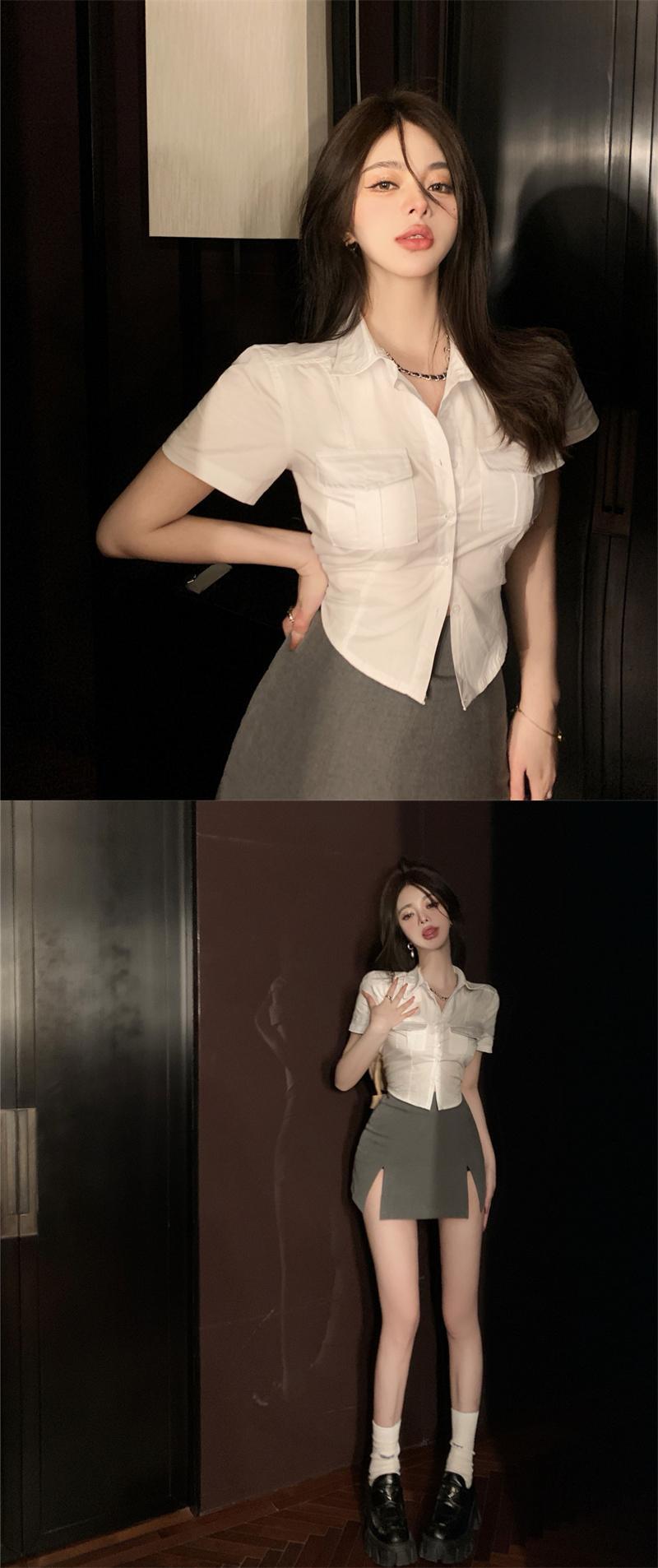 ダブルポケットショートホワイトシャツ サマートップス 夏物 10/5 秋冬 オータム ウインター ナチュラル mi4692898021212