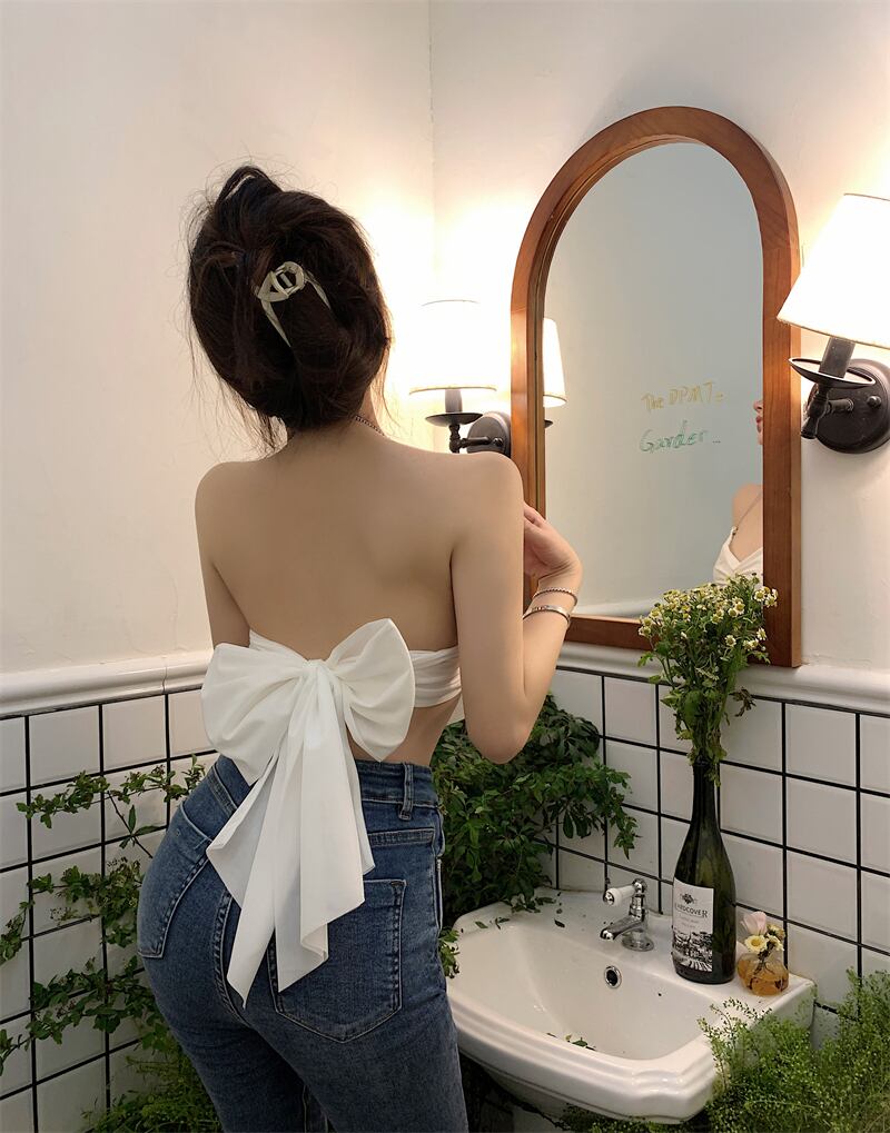 バックレスリボンホルターサマースリムホワイトショートトップス 夏物 10/5 秋冬 オータム ウインター ナチュラル mi4684464166189