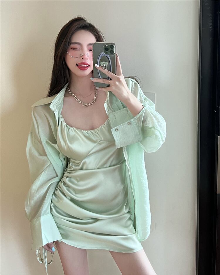 色:シャンパンシャツ,ライトグリーンのシャツ,シャンパンスリングドレス,ライトグリーンのドレス