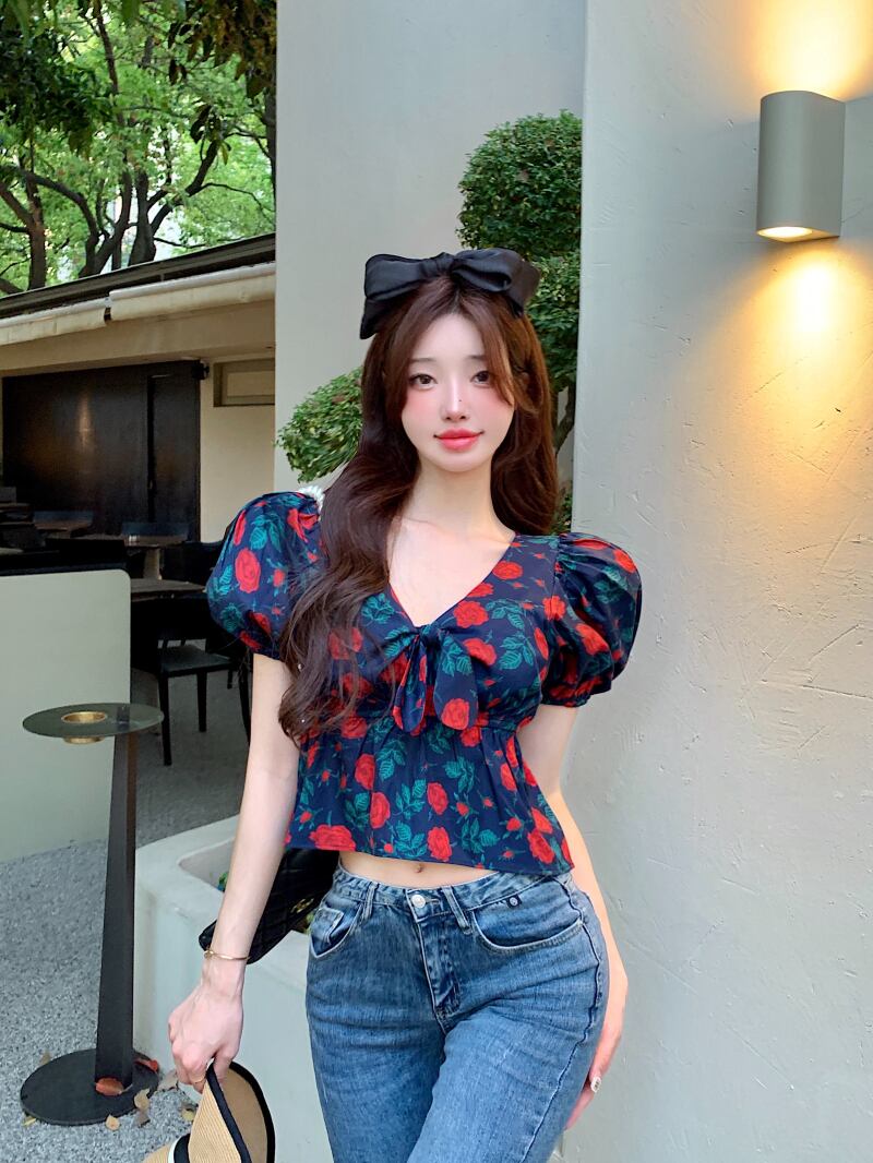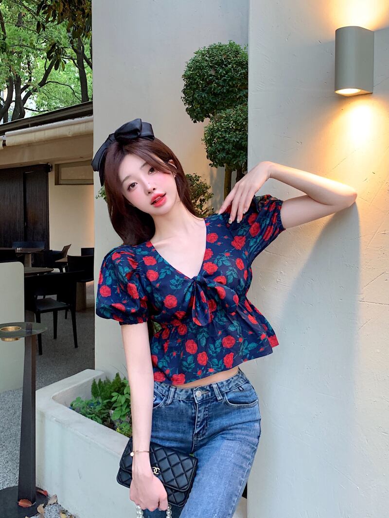 Vネックリボンフローラルシフォンシャツ サマースリーブウェストトップス 夏物 花柄 10/5 秋冬 オータム ウインター ナチュラル mi4662831959268