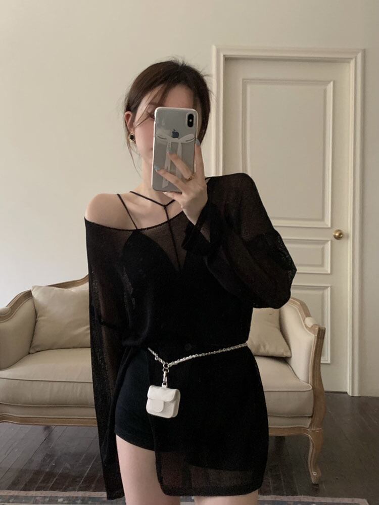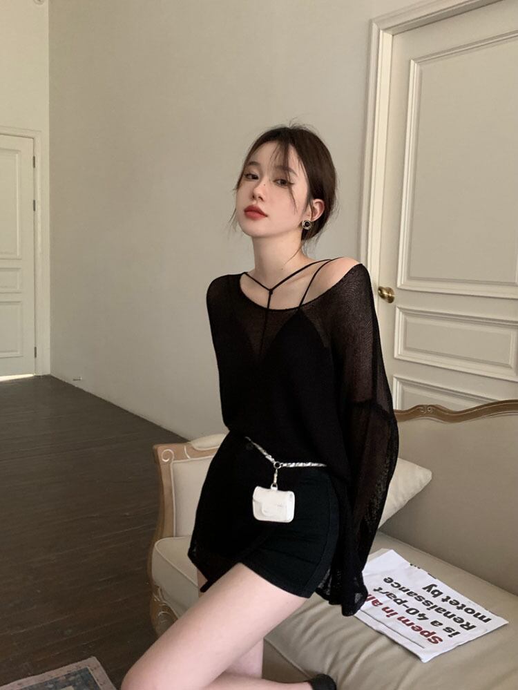 ブラックTシャツ オータム薄手ブラウス ルーズスリットトップス ロング 秋物 10/5 秋冬 オータム ウインター ナチュラル mi4669253444944