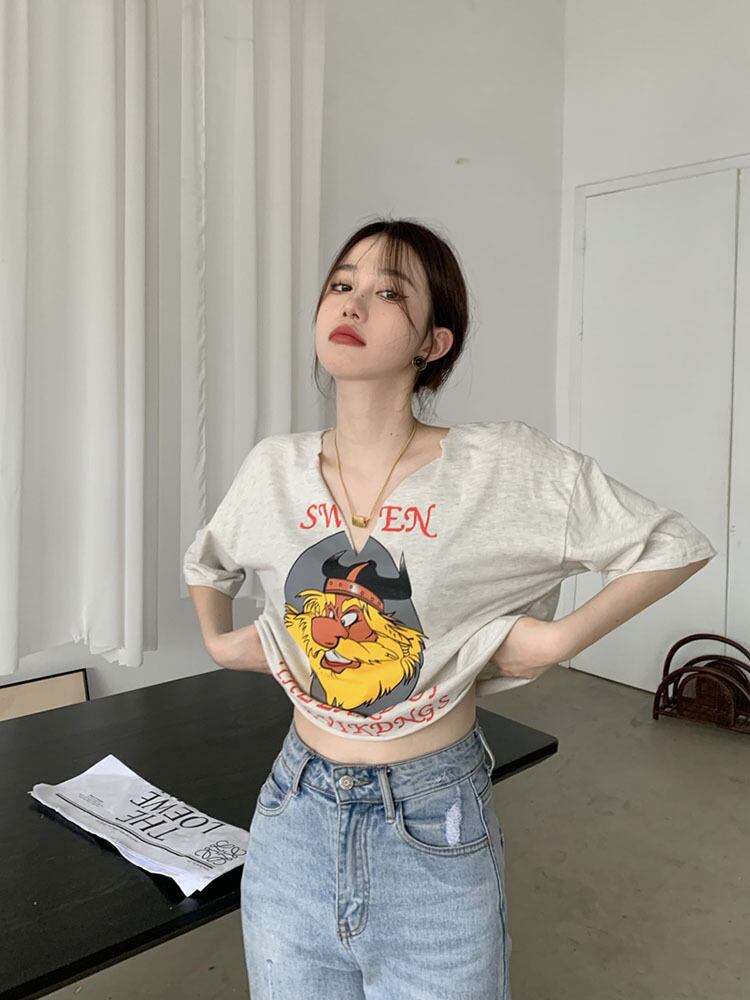 スタンダードプリントショートTシャツ サマーVネックルーズトップス レトロ 夏物 10/5 秋冬 オータム ウインター ナチュラル mi4625008053248