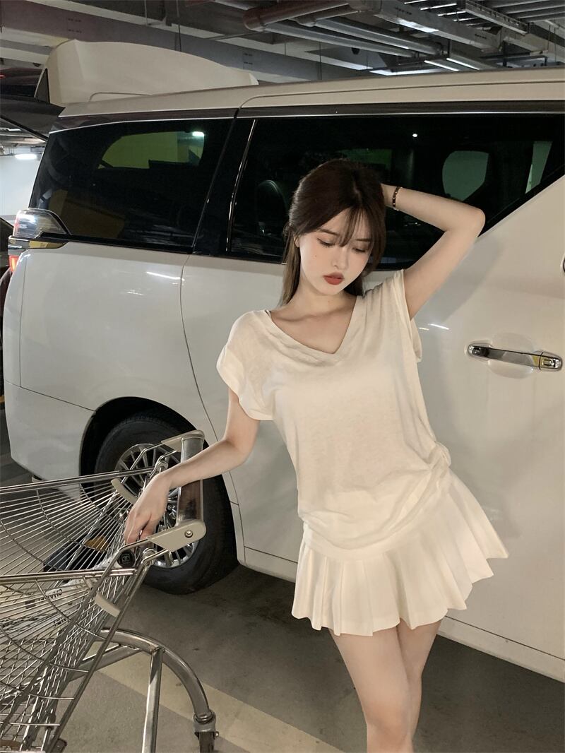 ホワイトVネックTシャツ サマープリーツスリムトップス 夏物 10/5 秋冬 オータム ウインター ナチュラル mi4671643717098