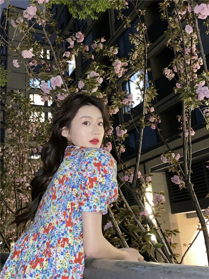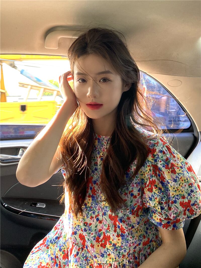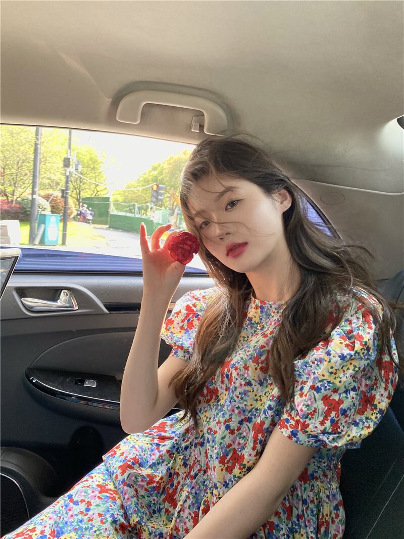 フローラルスリーブドレス サマープリーツウェスト薄手スカート 夏物 花柄 10/5 秋冬 オータム ウインター ナチュラル mi4689412455469