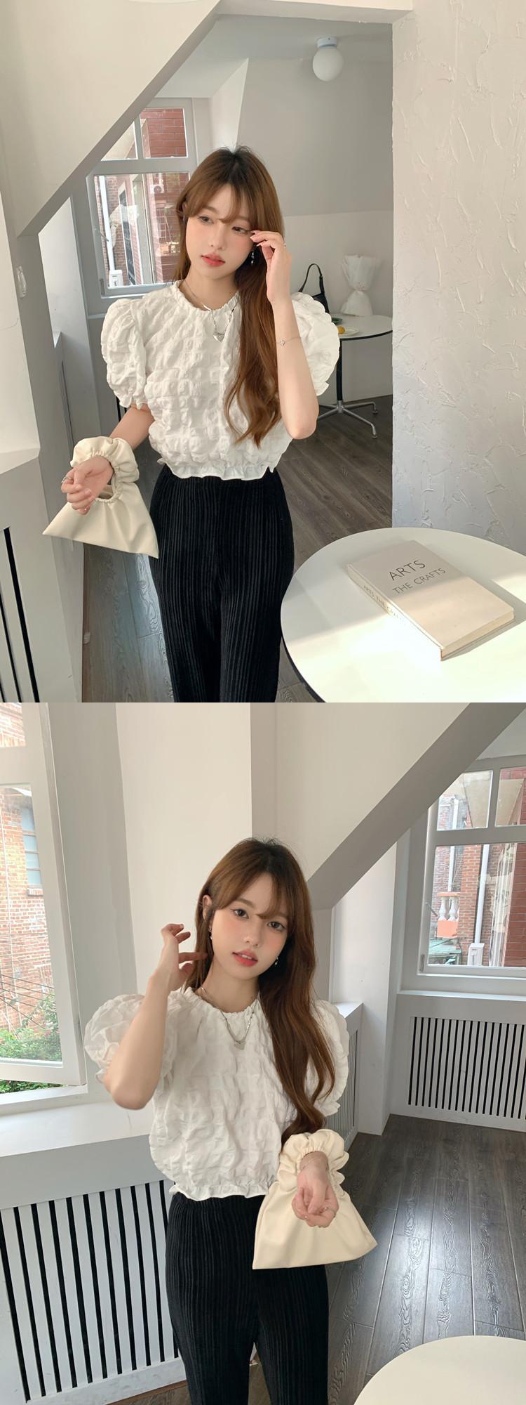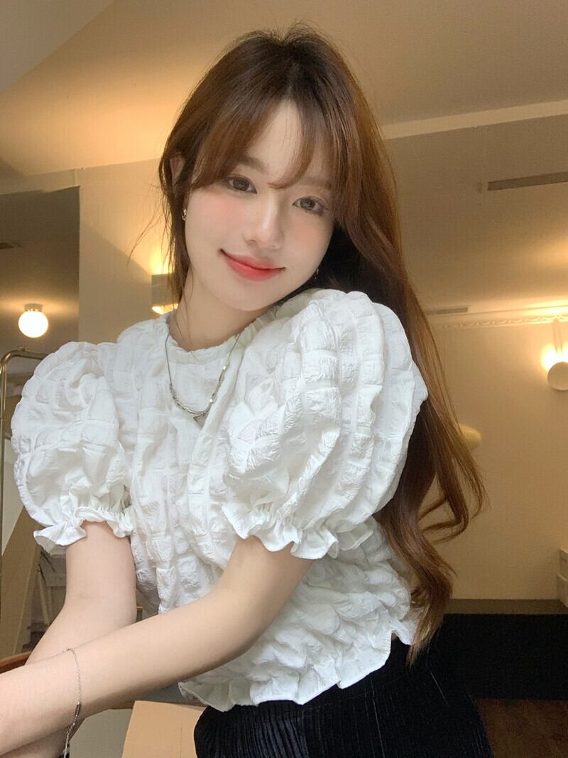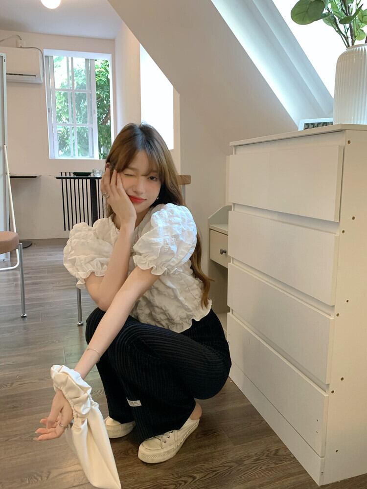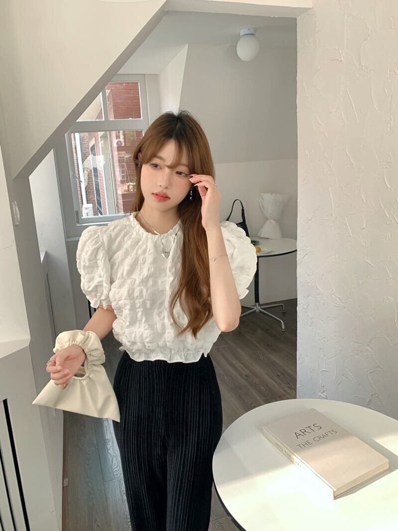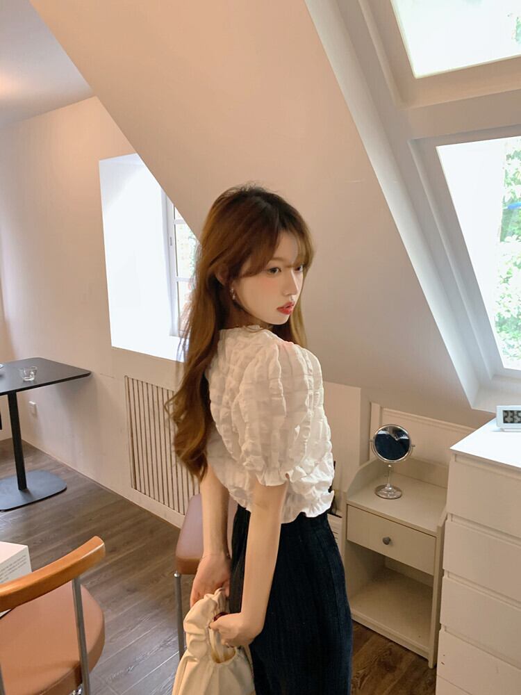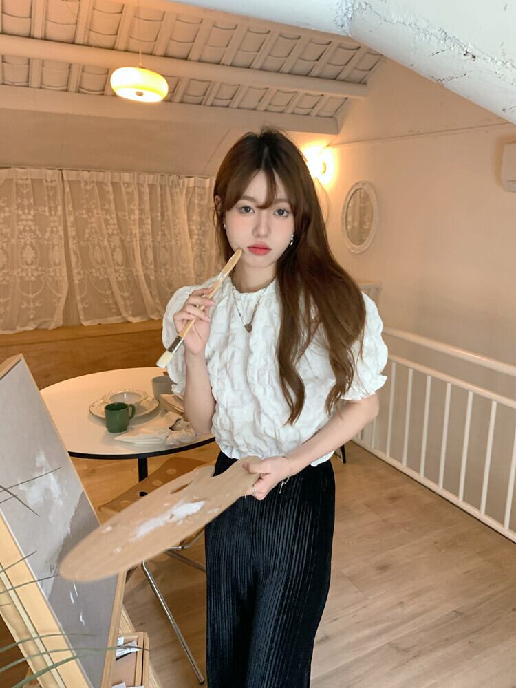 ホワイトスリーブシャツ サマープリーツスリムショートトップス 夏物 10/5 秋冬 オータム ウインター ナチュラル mi4683065410093