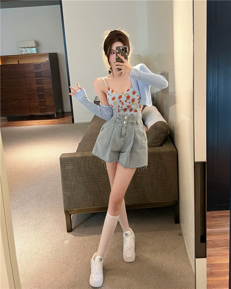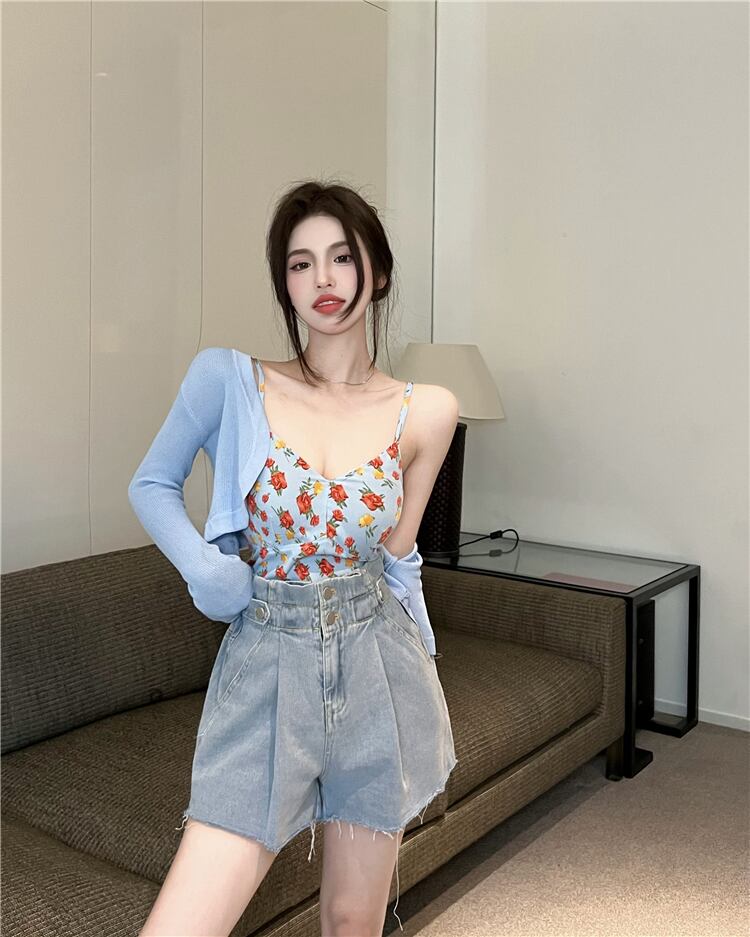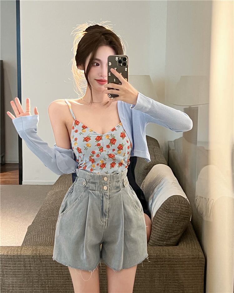 色:花柄のストラップ,カーディガンワンピース,デニムショーツシングルピース