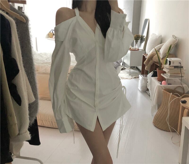スタイルホワイトホルターシャツ ドレス サマーVネックギャザーウェストAラインスカート 夏物 10/5 秋冬 オータム ウインター ナチュラル mi4634802713541