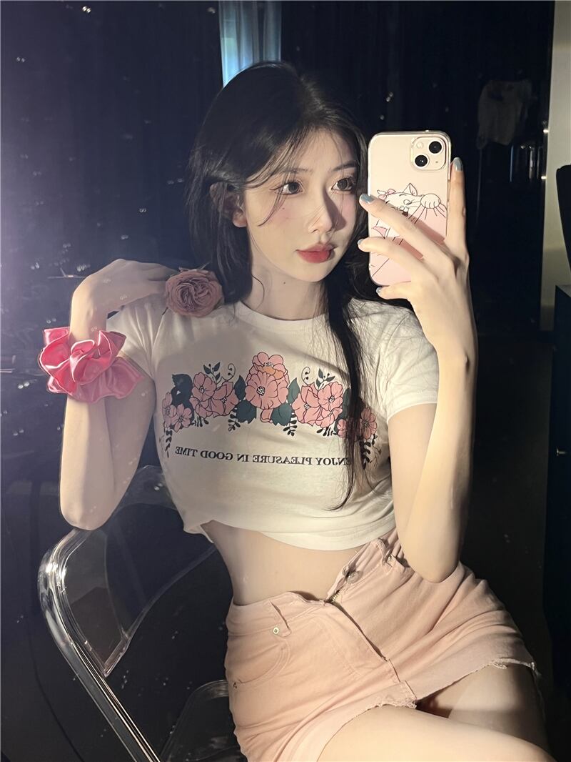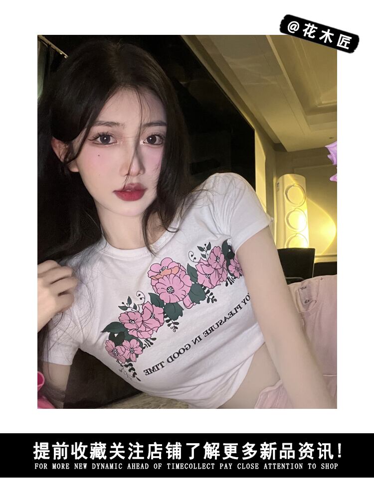 Flowerデザイン プリント柄ホワイトショートTシャツ サマースリムフィット薄手トップス 夏物 ピュア フラワーデザイン 10/5 秋冬 オータム ウインター ナチュラル mi4628566041933