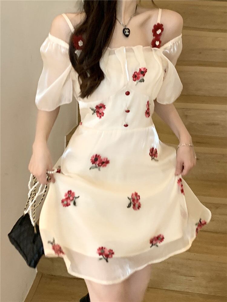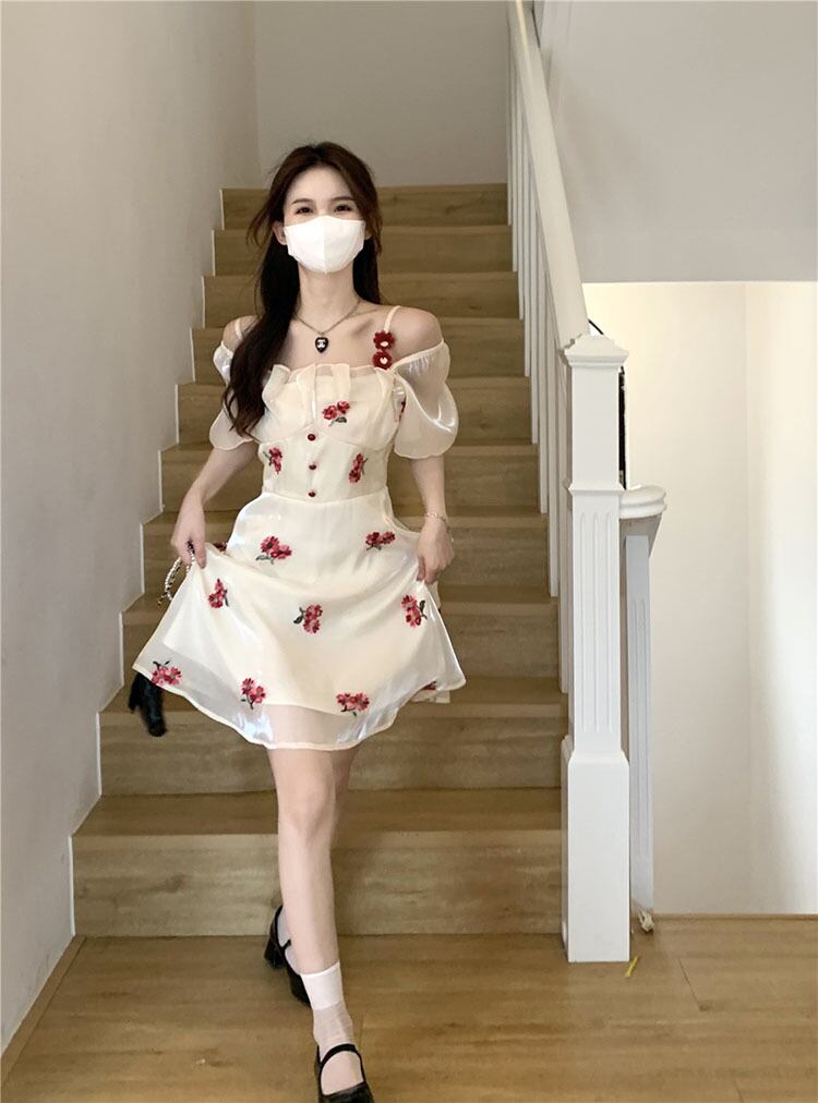 Flowerデザイン ドレス サマーウェストAラインスカート 大人ガーリー スウィート キュート カジュアル 夏物 フラワーデザイン スクウェア 10/5 秋冬 オータム ウインター ナチュラル mi4612772877098
