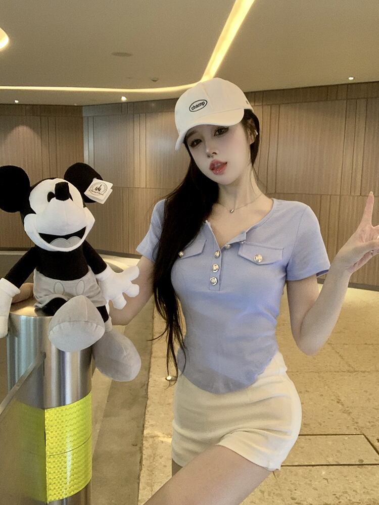 ブルーショートTシャツ シャツ サマーボタンスリムトップス 夏物 10/5 秋冬 オータム ウインター ナチュラル mi4658058193024