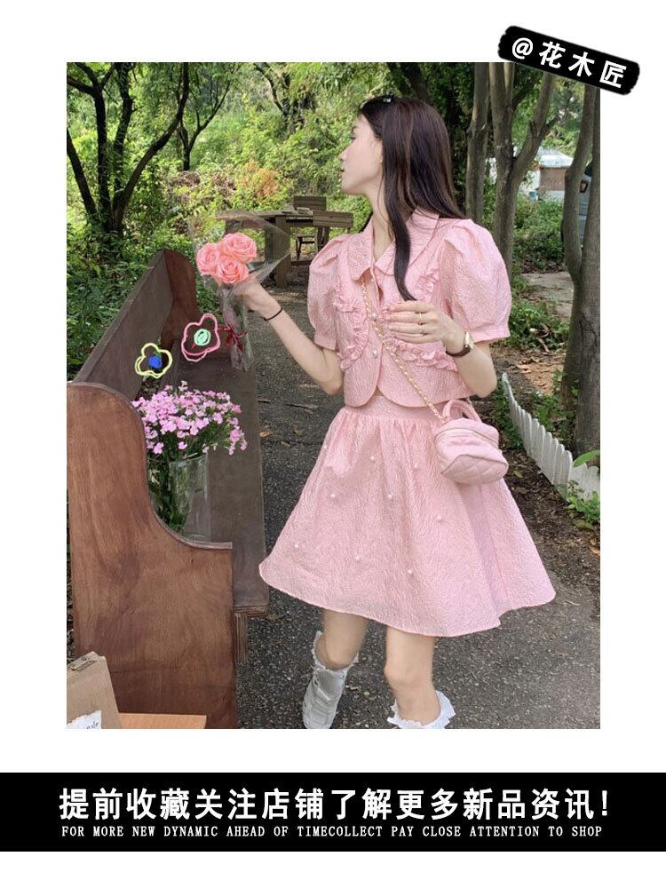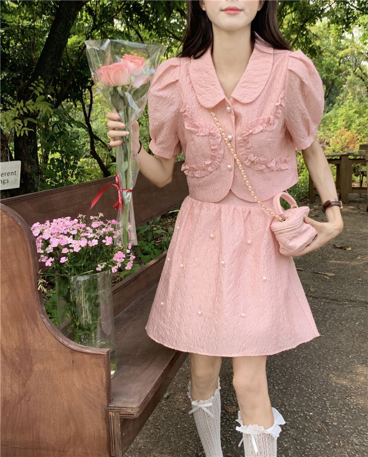 カラーシャツ サマーパールショートスリーブトップス ピンク 大人ガーリー スウィート キュート カジュアル 夏物 真珠 10/5 秋冬 オータム ウインター ナチュラル mi4625723188873