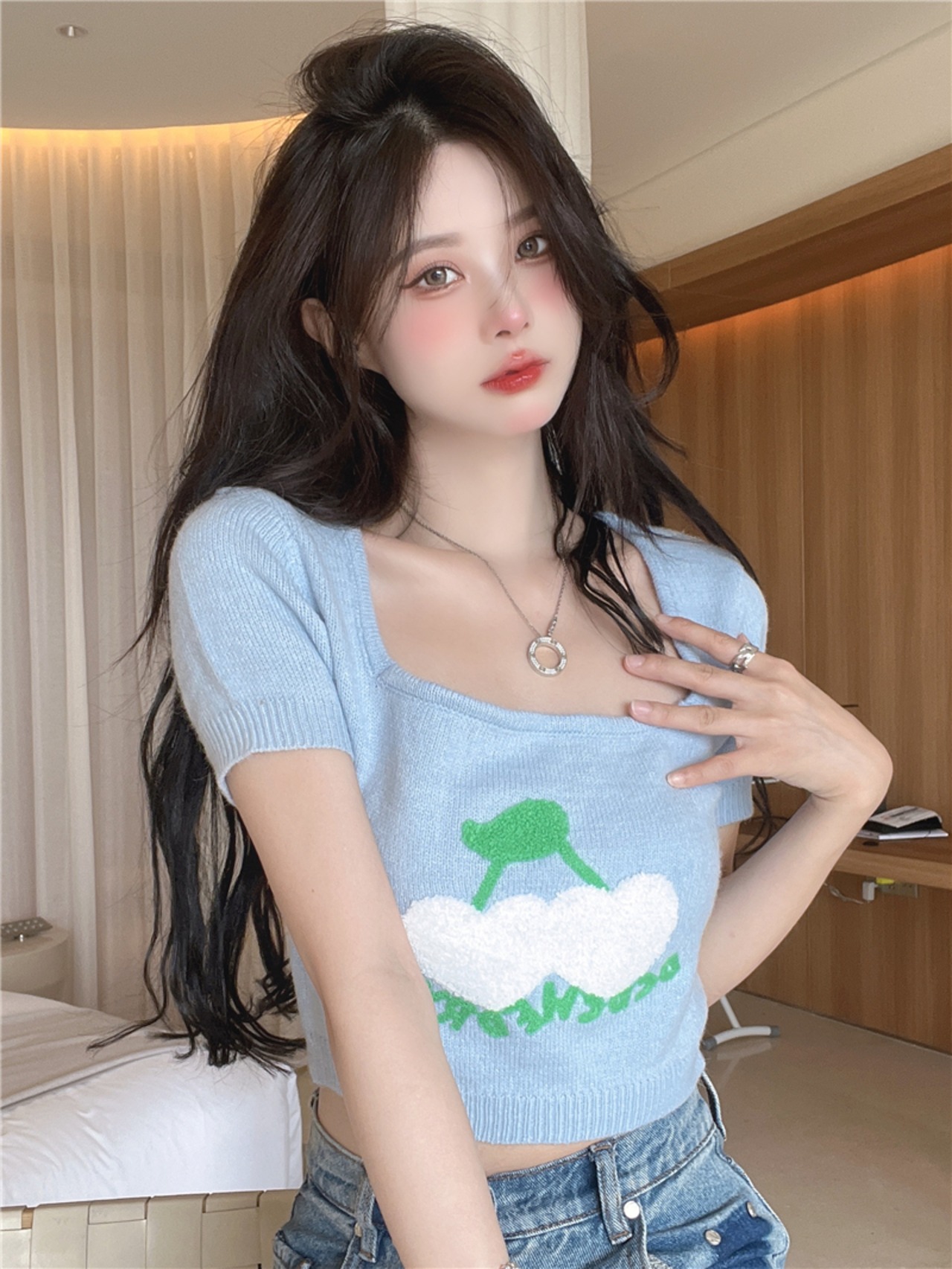 ショートTシャツ サマースタイルカラースリムニットトップス レッド 刺繍 夏物 スクウェア 10/5 秋冬 オータム ウインター ナチュラル mi4611531118980