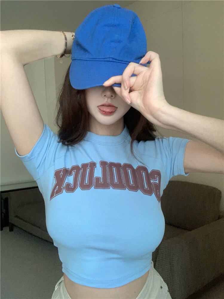 プリント柄ブルーショートTシャツ サマークロップドトップス 夏物 10/5 秋冬 オータム ウインター ナチュラル mi4611845488975