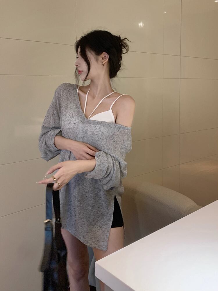グレーVネック薄手ブラウス ニットセーター オータムルーズトップス ロング 秋物 10/5 秋冬 オータム ウインター ナチュラル mi4659142611839