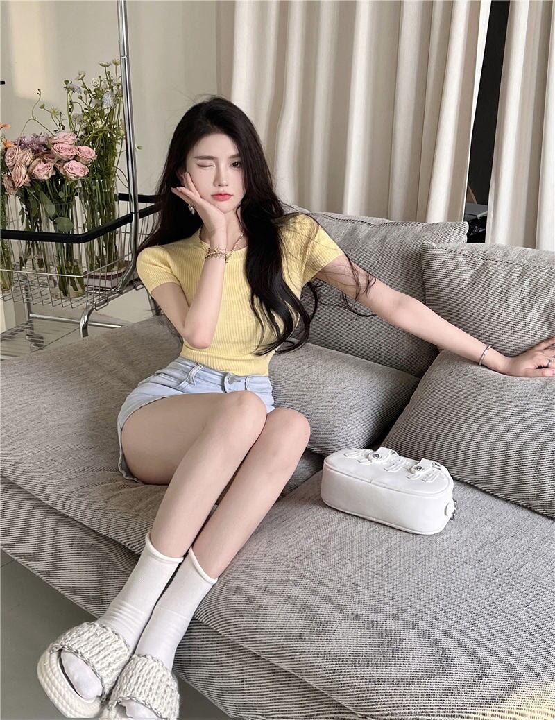 スタイルイエローTシャツ サマースリムフィットニットトップス 夏物 10/5 秋冬 オータム ウインター ナチュラル mi4635914473178