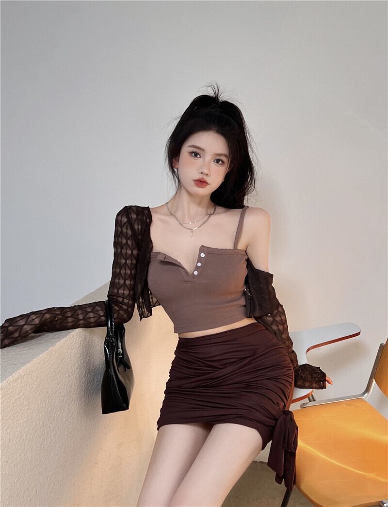 色:ダークブラウンカーディガン,ダークブラウンのサスペンダー,ダークブラウンメッシュスカート