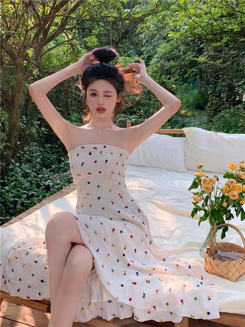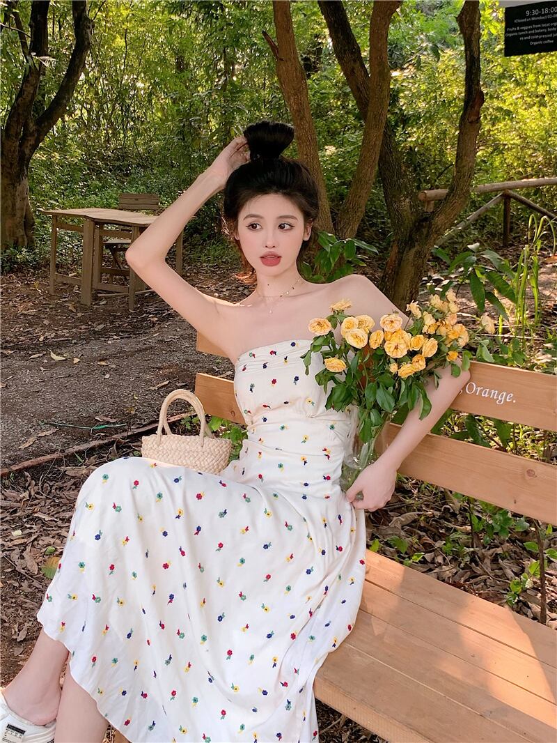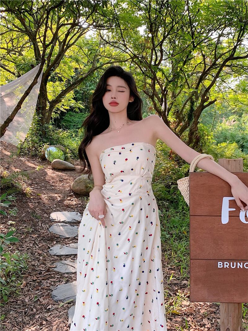 フローラルトップス ドレス サマープリーツウェストロングスカート レッド 刺繍 夏物 花柄 10/5 秋冬 オータム ウインター ナチュラル mi4637364587277