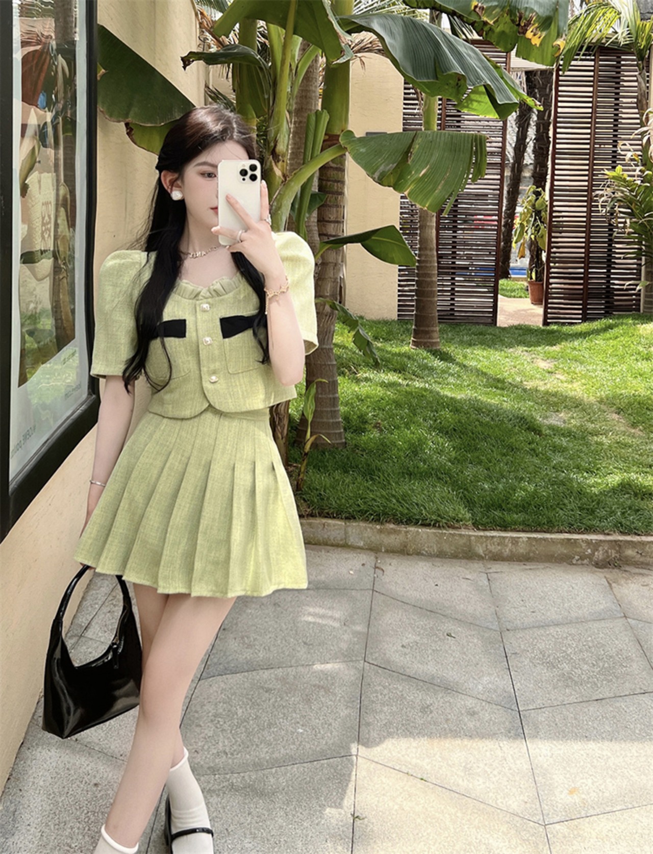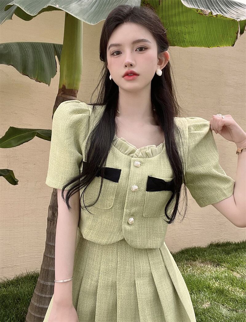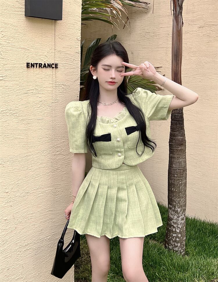 サマーショートトップス ハイウェストウェストプリーツスカート セット 夏物 10/5 秋冬 オータム ウインター ナチュラル mi4639798932905