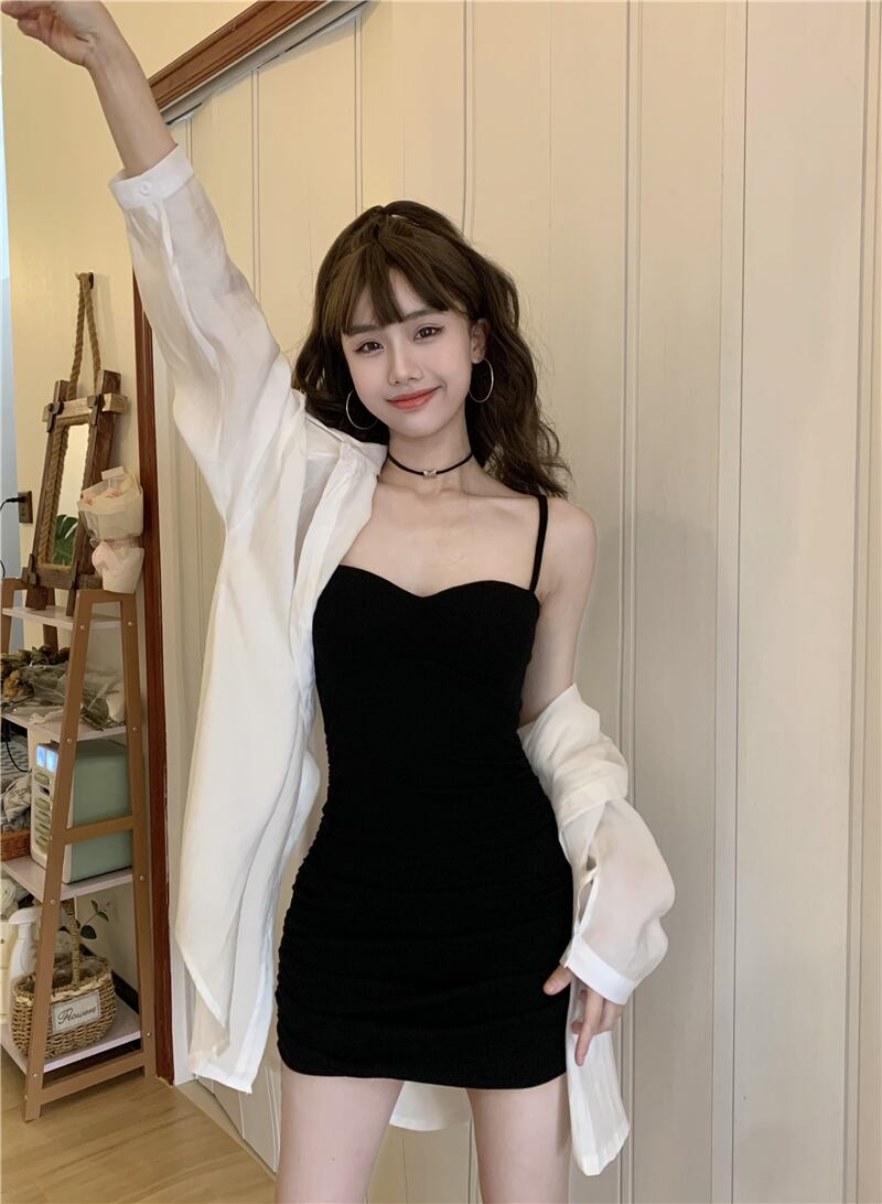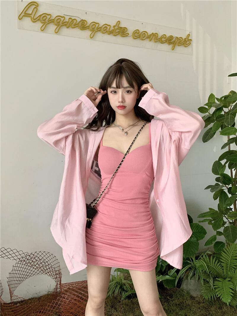 色:ブラックサスペンダースカート,ピンクのサスペンダードレス,白日焼け防止シャツ,ピンクの日焼け止めシャツ