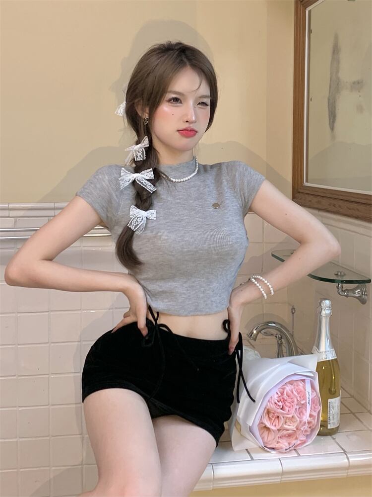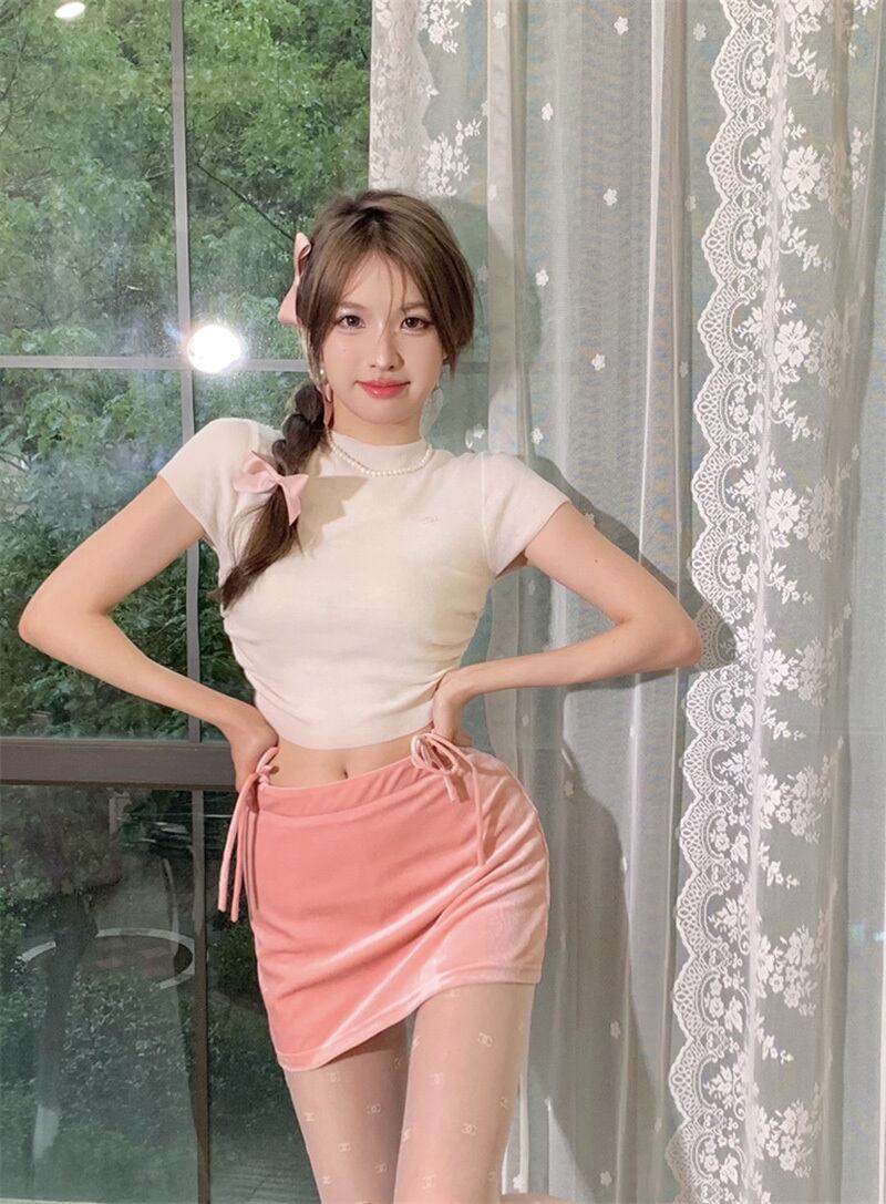 色:オフホワイトショートスリーブT,バーガンディショートスリーブT,ライトグレーショートスリーブT,ブラックベルベットスカート,ピンクのベルベットスカート
