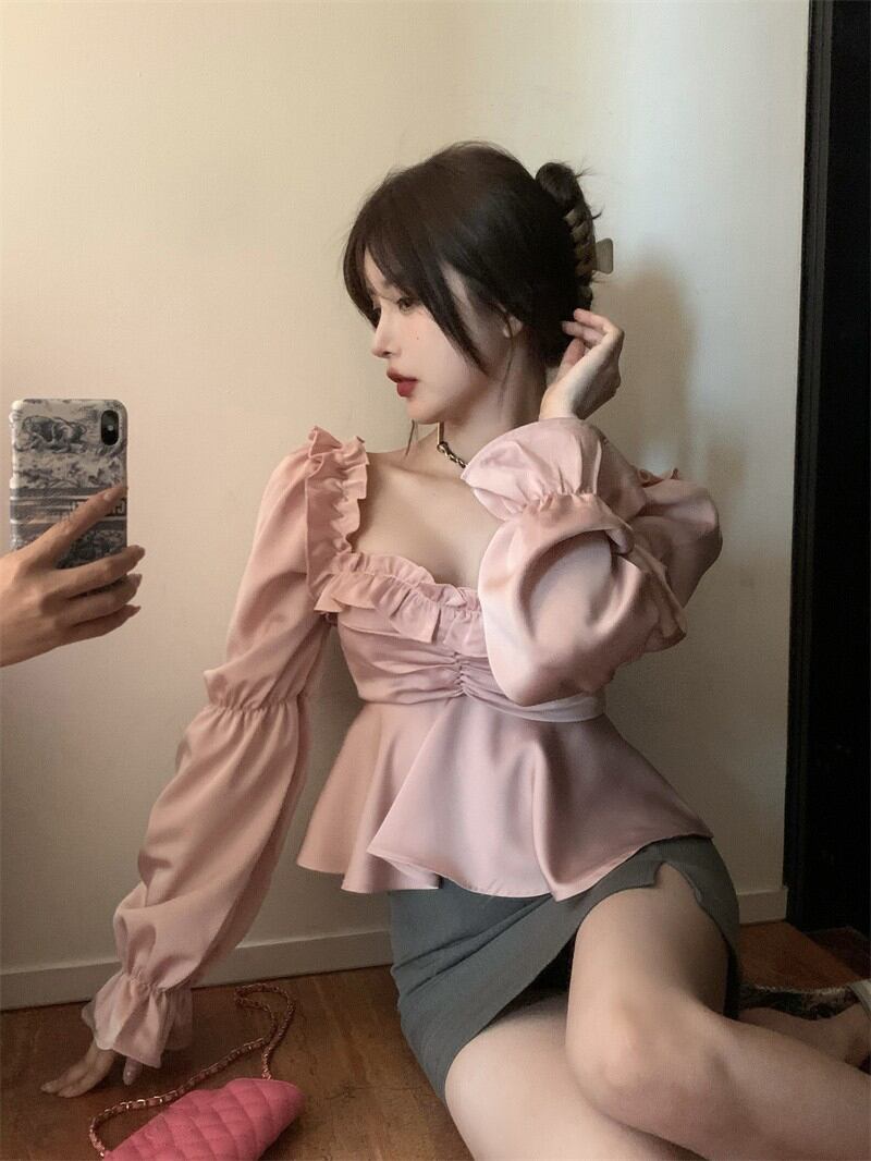 サテンシャツ オータムウェストショートトップス ピンク 秋物 10/5 秋冬 オータム ウインター ナチュラル mi4622845316447