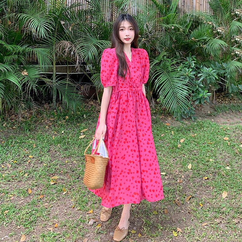 レッドフローラルスリーブドレス サマープリーツウェストスカート 夏物 花柄 10/5 秋冬 オータム ウインター ナチュラル mi4630037192436