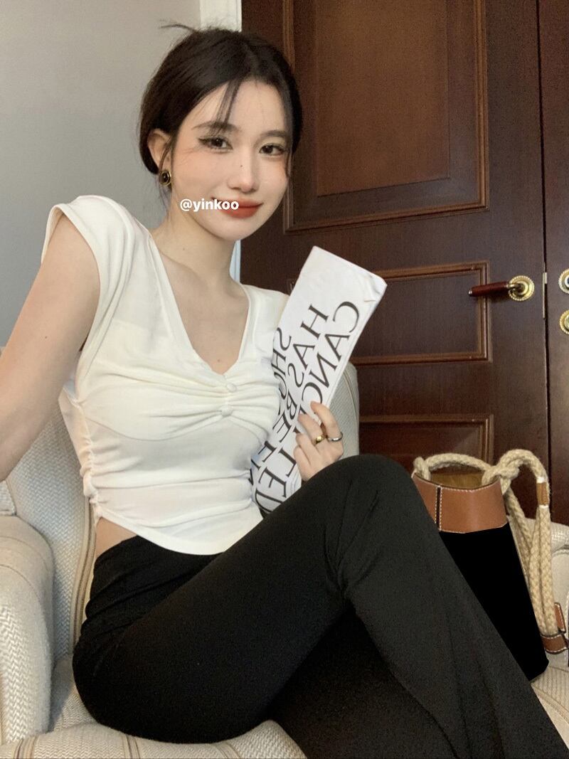 プリーツVネックホワイトショートTシャツ サマースリムトップス 夏物 10/5 秋冬 オータム ウインター ナチュラル mi4623225577050