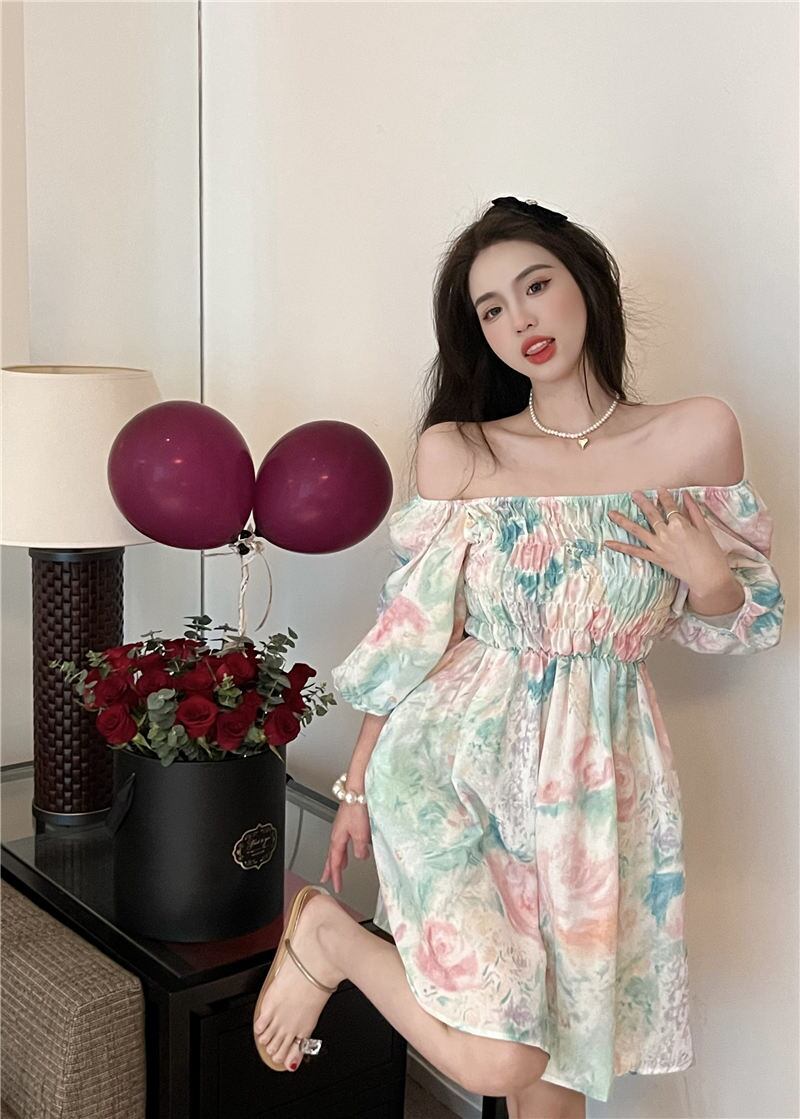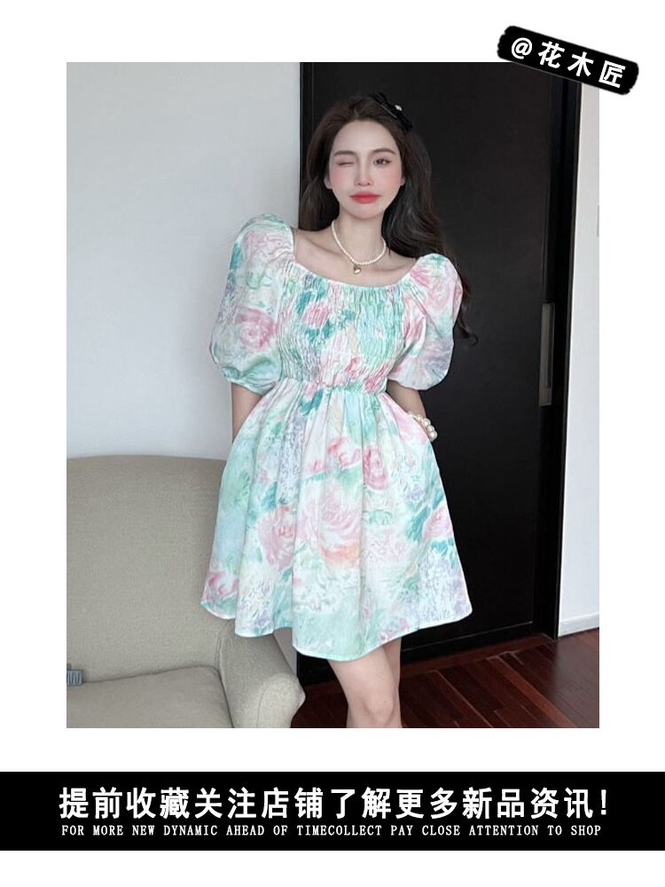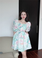 スリーブフローラルドレス サマーカラーウェストAラインスカート 大人ガーリー スウィート キュート カジュアル 夏物 花柄 スクウェア 10/5 秋冬 オータム ウインター ナチュラル mi4669884086763