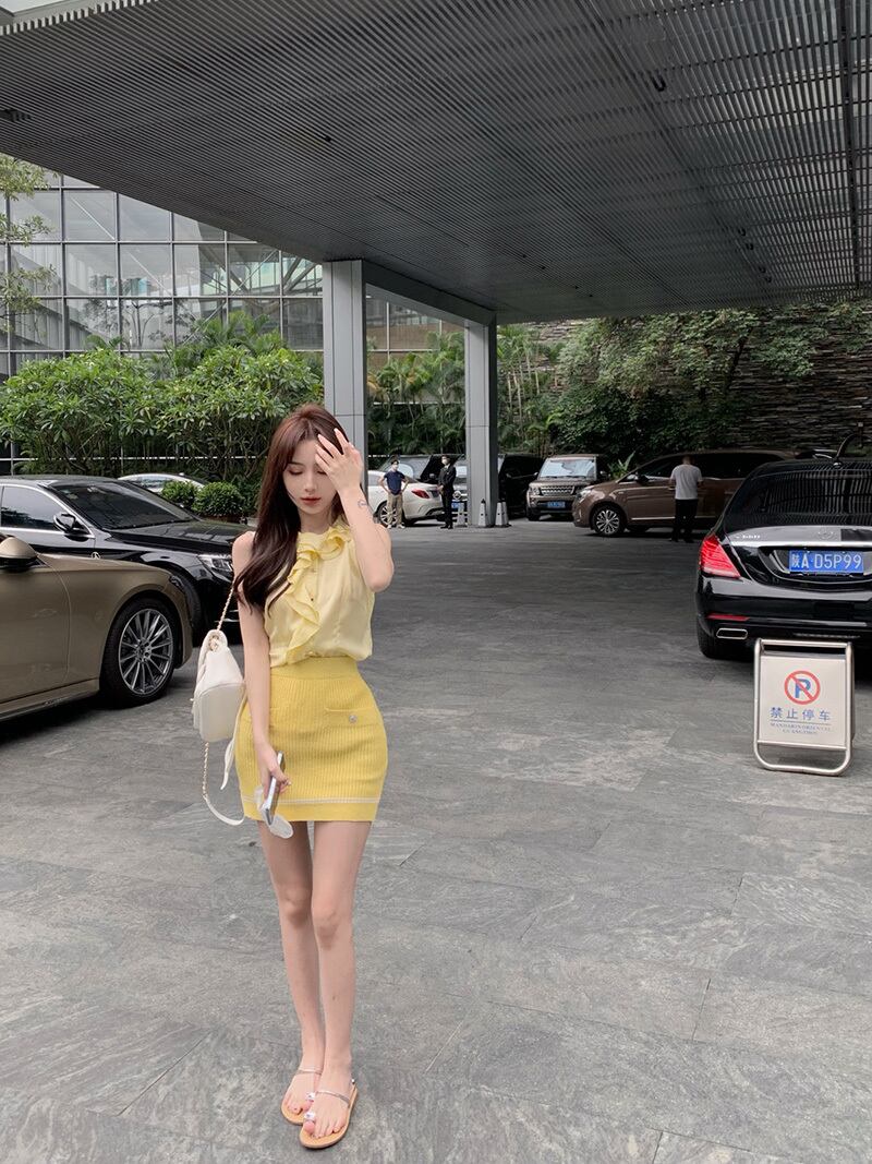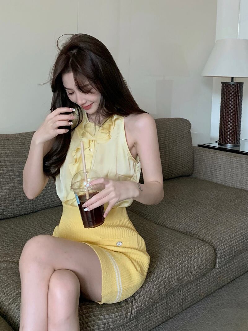 サテンイエローノースリーブシフォントップス サマースリムシャツ 夏物 10/5 秋冬 オータム ウインター ナチュラル mi4639309322323