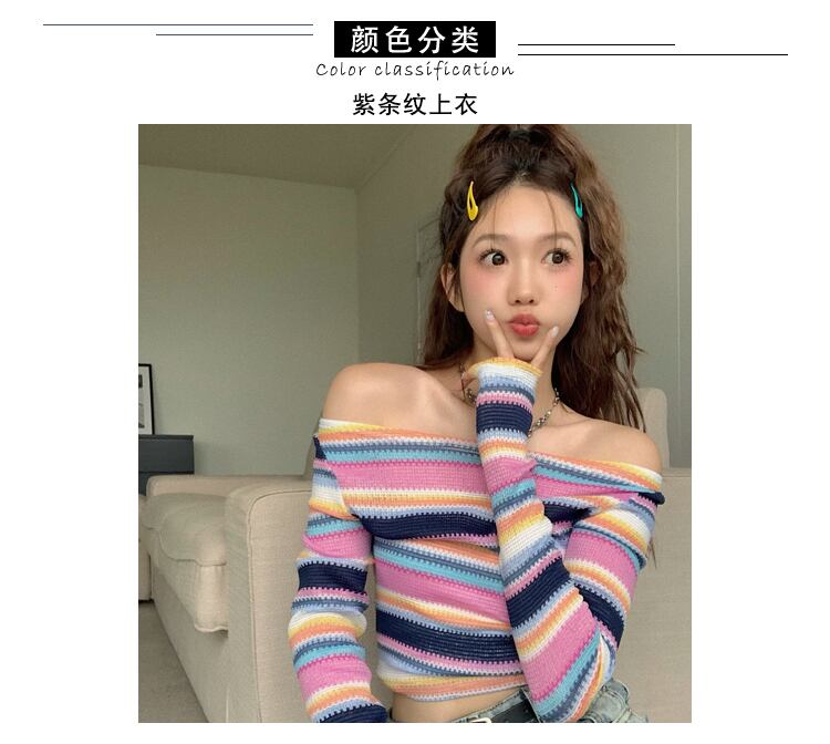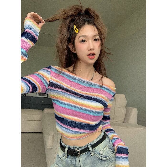 ストライプセーター オータムスリムショートトップス ロング 大人ガーリー スウィート キュート カジュアル 秋物 ピュア 10/5 秋冬 オータム ウインター ナチュラル mi4627858230024