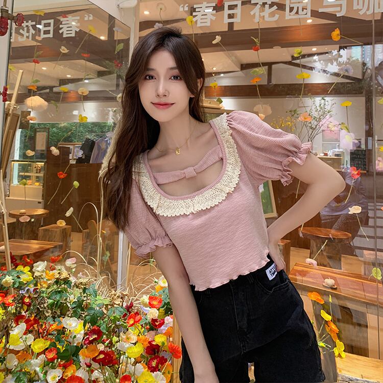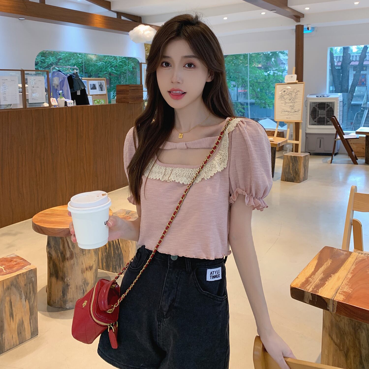 レースショートTシャツ サマースリムトップス 大人ガーリー スウィート キュート カジュアル 夏物 ステッチ 10/5 秋冬 オータム ウインター ナチュラル mi4693936716386