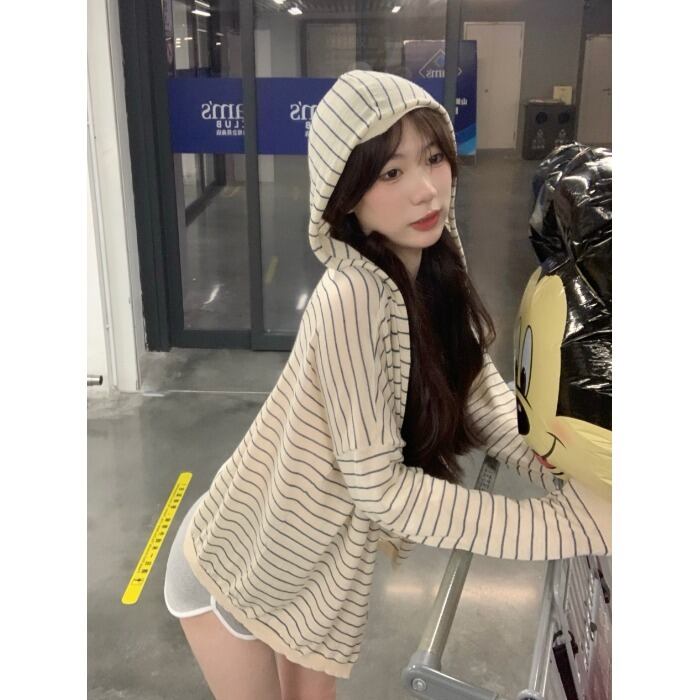 カジュアルストライプフードジャケット オータムスタイルルーズトップス ロング 秋物 10/5 秋冬 オータム ウインター ナチュラル mi4670452790966
