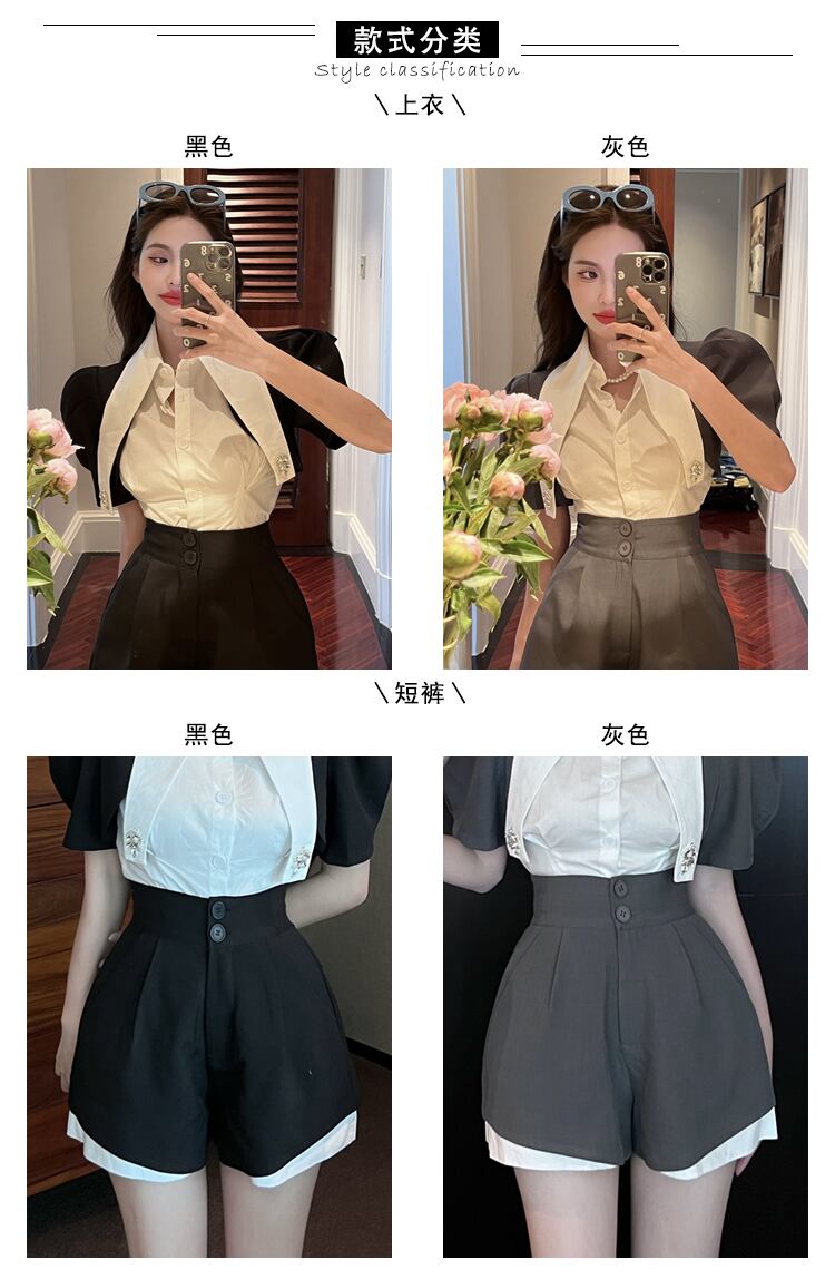 色:ブラックトップシングルピース,グレートップシングルピース,ブラックショーツワンピース,グレーのショートパンツ