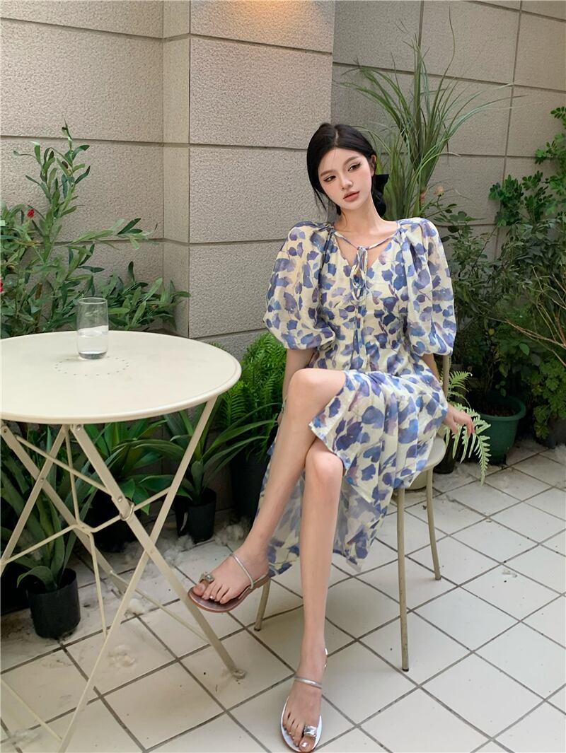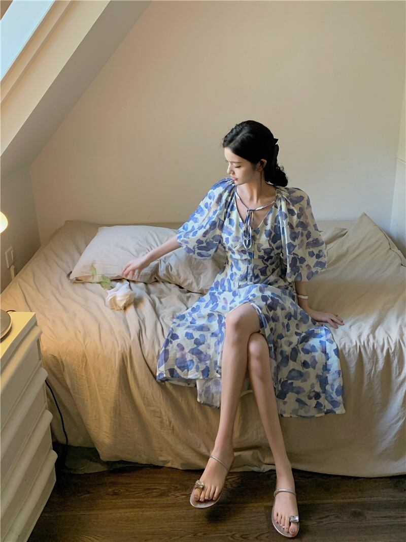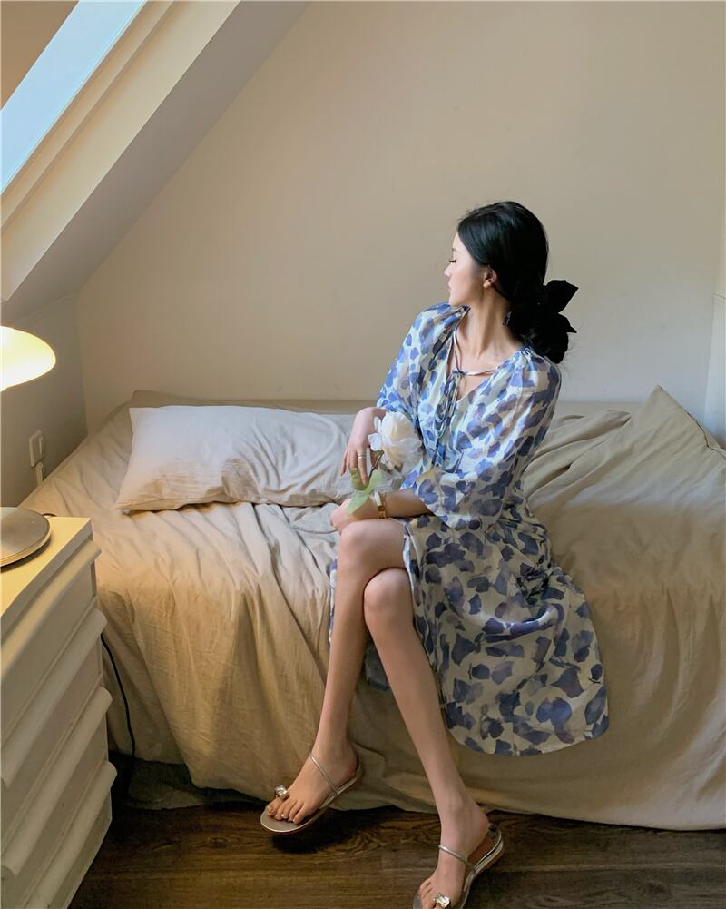 Vネックプリントスリーブドレス サマースタイルバンドウェストスリットスカート 夏物 10/5 秋冬 オータム ウインター ナチュラル mi4689263170149